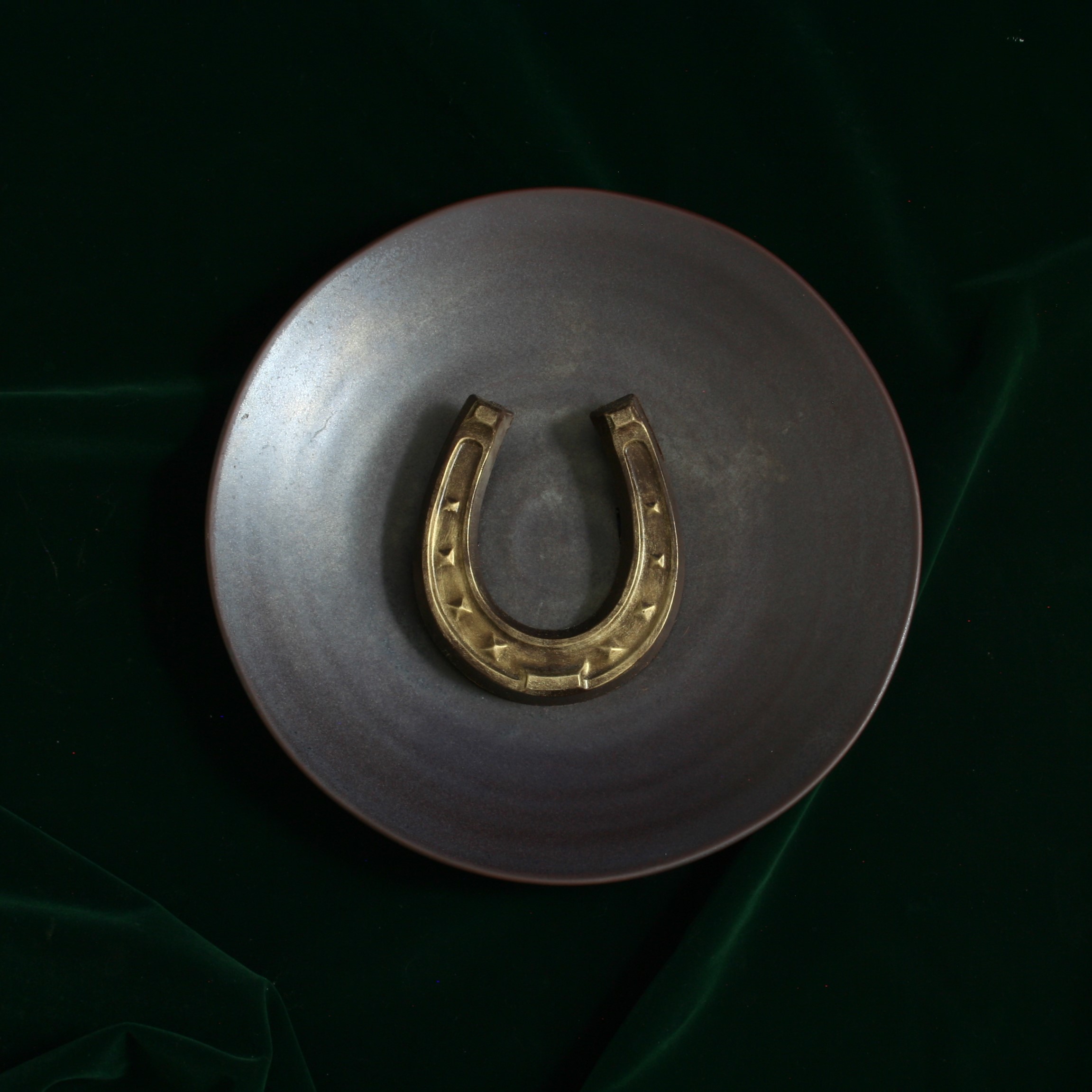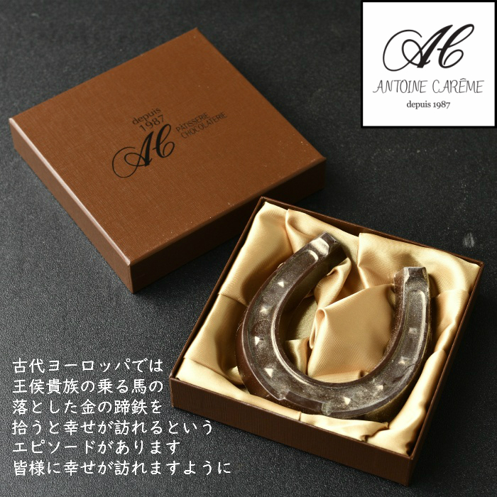 蹄鉄をモチーフにしたチョコレート。カカオ分56%のチョコレートの中には、ヘーゼルナッツとミルクチョコレートから作られるジャンドゥーヤ・レを絞り込みました。欧州では、古来より蹄鉄は幸せをもたらすモチーフ。表面には、金の粉を全体に施し本物のような質感をイメージしました。 「アントワーヌ・カレーム」がある目黒区下目黒界隈には、現在府中にある東京競馬場の前身、 目黒競馬場があった場所ということで、 土地柄にちなみ作り上げました。