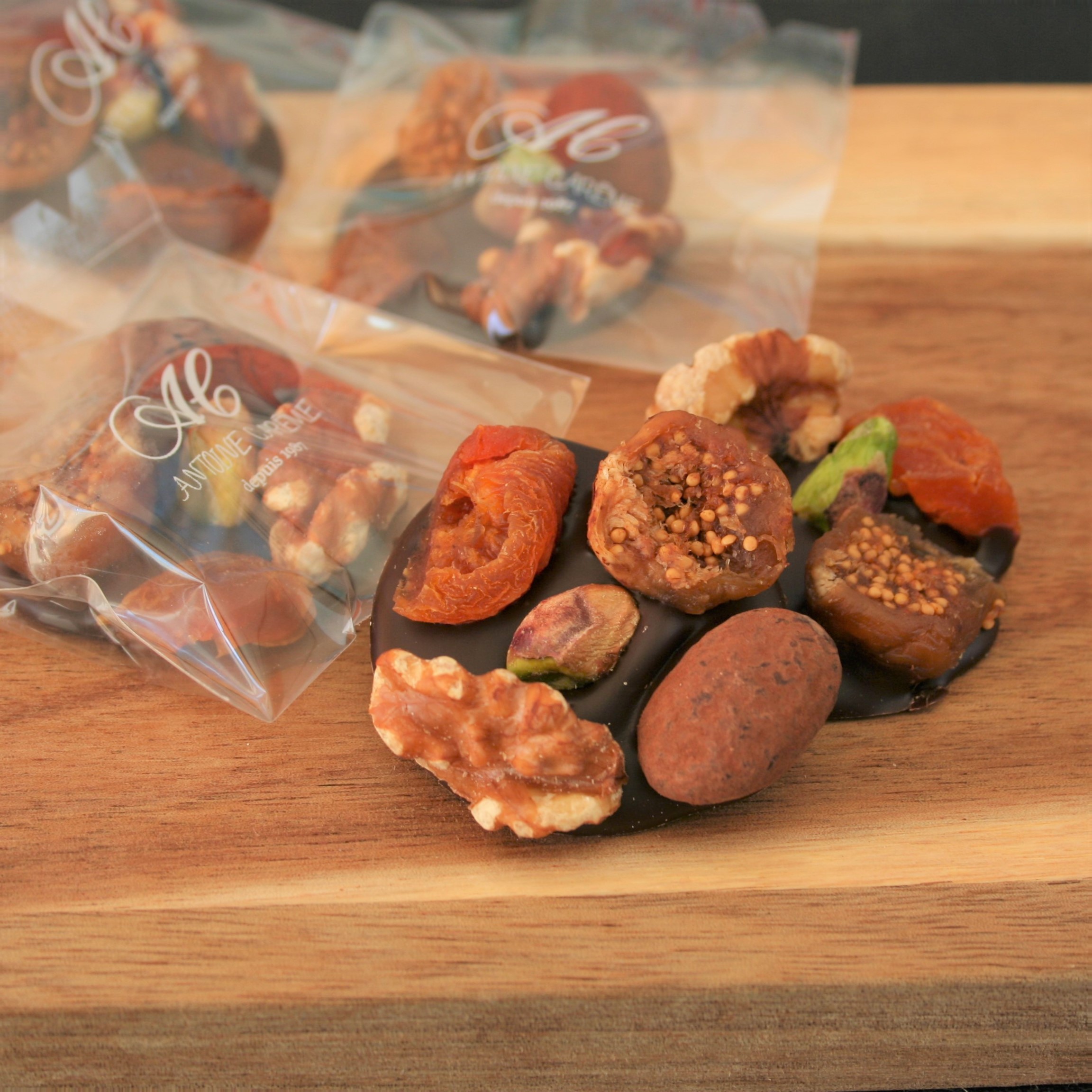 ダークチョコレートにドライ杏、ドライイチジク、アーモンド、クルミ、ピスタチオをのせた1枚です。いろいろな味を楽しめるチョコレートです。 箱のサイズ 7cm×13cm×3.8cm(横×縦×高さ) 賞味期限 発送日より20日間