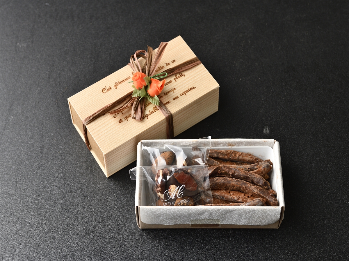 1987年の創業から愛される、おしゃれなフランス菓子のお店「アントワーヌ・カレーム」のオランジェットと1枚でいろいろな味を楽しめるモノカルプのセットです。ほろ苦さとチョコレートの甘さのバランスが自慢のオランジェットとダークチョコレートにドライ杏、ドライイチジク、アーモンド、クルミ、ピスタチオをのせたモノカルプが2枚セットになった贅沢なお菓子です。