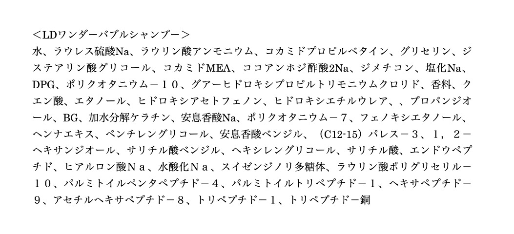 | 内容量 | 【LDワンダーバブルシャンプー】 250ml 【LDワンダーバームトリートメント】 200ml 【LDワンダーティアトリートメント】 250ml |