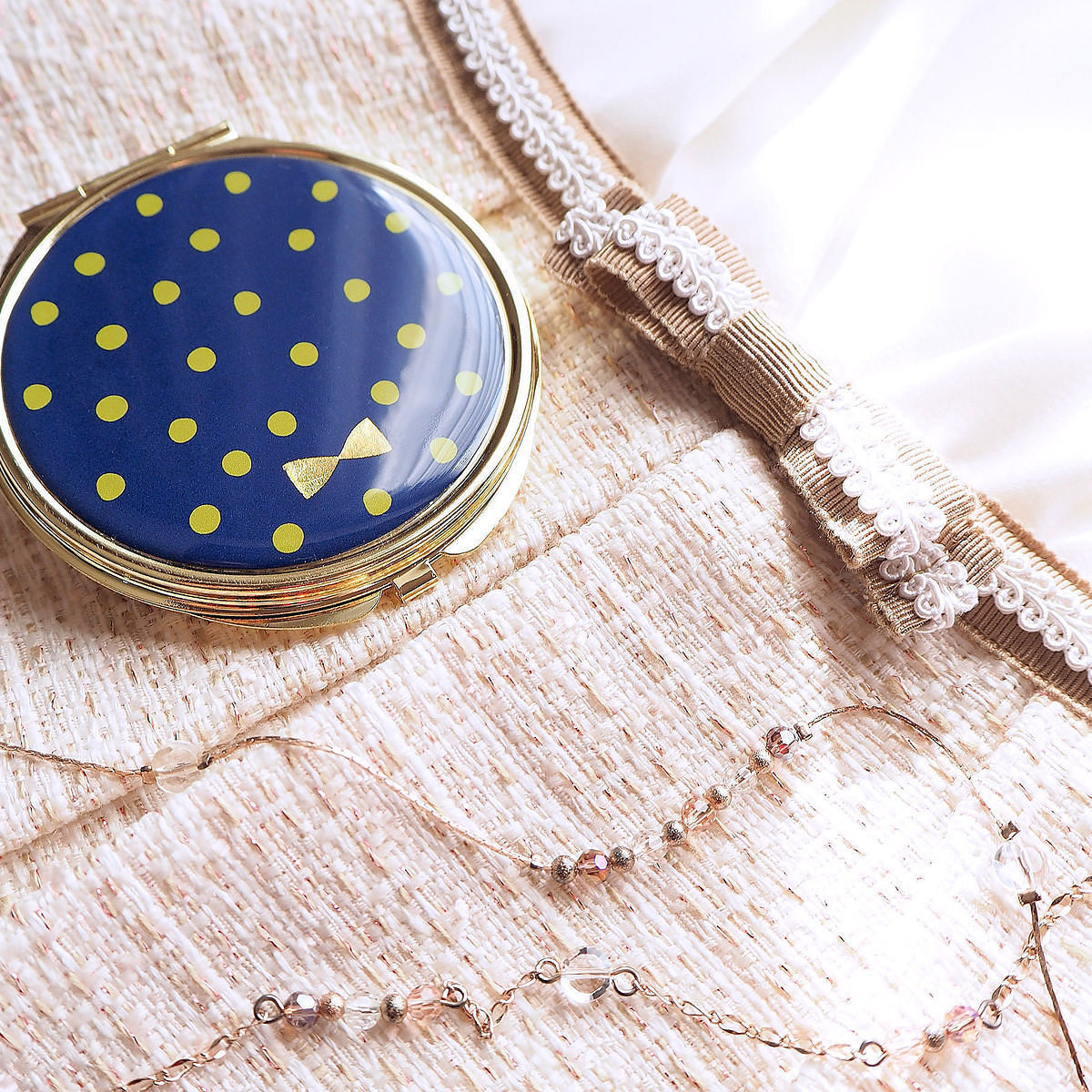 水玉模様が可愛らしいコンパクトミラーです。持ち歩くのにもちょうど良いサイズになっています。