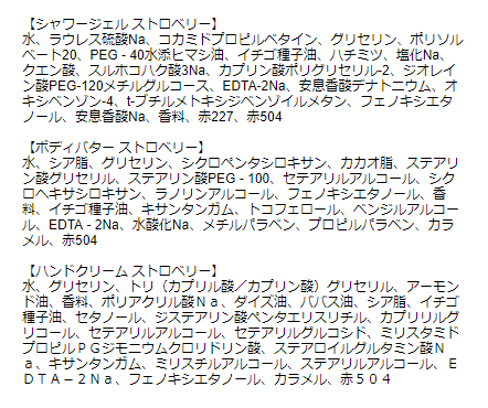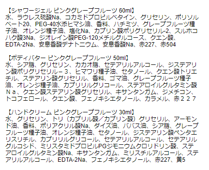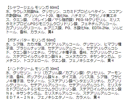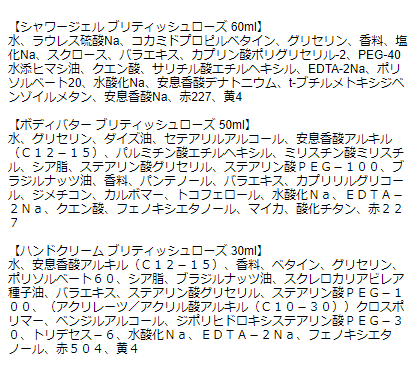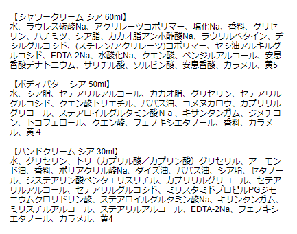 | 商品内容量 | シャワージェル:60mL ボディバター:50mL ハンドクリーム:30mL |