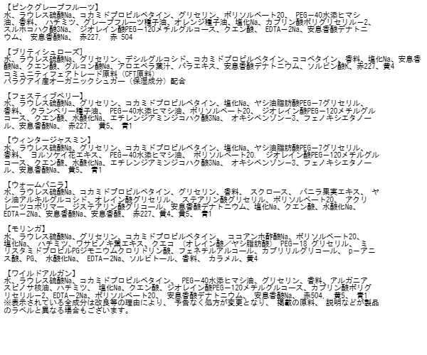 | ご使用方法 | 【シャワージェル】スポンジ、バスリリーなどでよく泡立ててご使用ください。 |