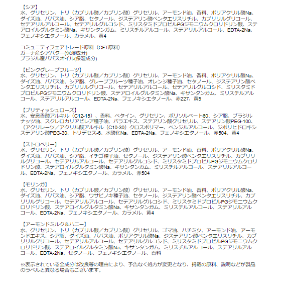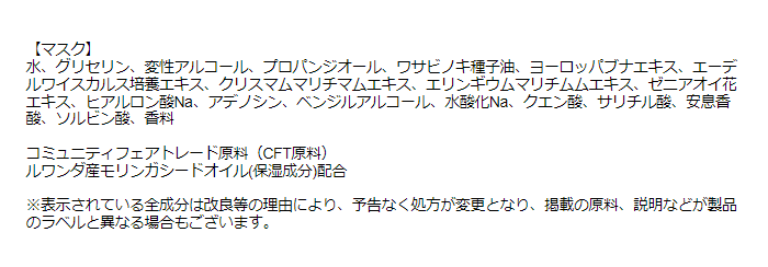 | 原産国 | 【マスク】タイ 【シャワージェル】イギリス 【ハンドクリーム】法定表示ラベルに記載 |