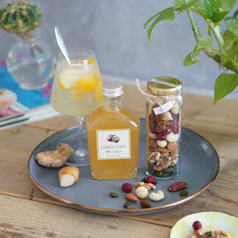 ハイグレードな素焼きナッツ&ドライフルーツのセットです。アレンジ自在な柚子ジンジャーコーディアルでセットでも単体ずつでもお愉しみいただけます。