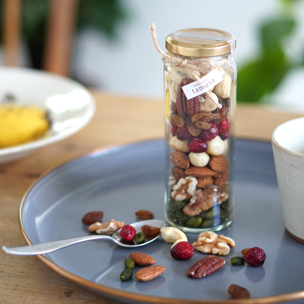 YAKIGASHI tamusaのナッツの特徴は、ナッツの新鮮さと独自のロースト技術。その日の気温・湿度、ナッツのコンディションに合わせて丁寧にじっくりとローストしています。 香ばしさとナッツ本来の旨味を引き出した食感に仕上げています。粒の割れや傷を少なくおさえられ、見た目も綺麗で味にバラツキがありません。 市販のナッツと比べていただくと良質な油脂のフレッシュ感と圧倒的な見栄えの良さなど、その違いをお判りいただけます。