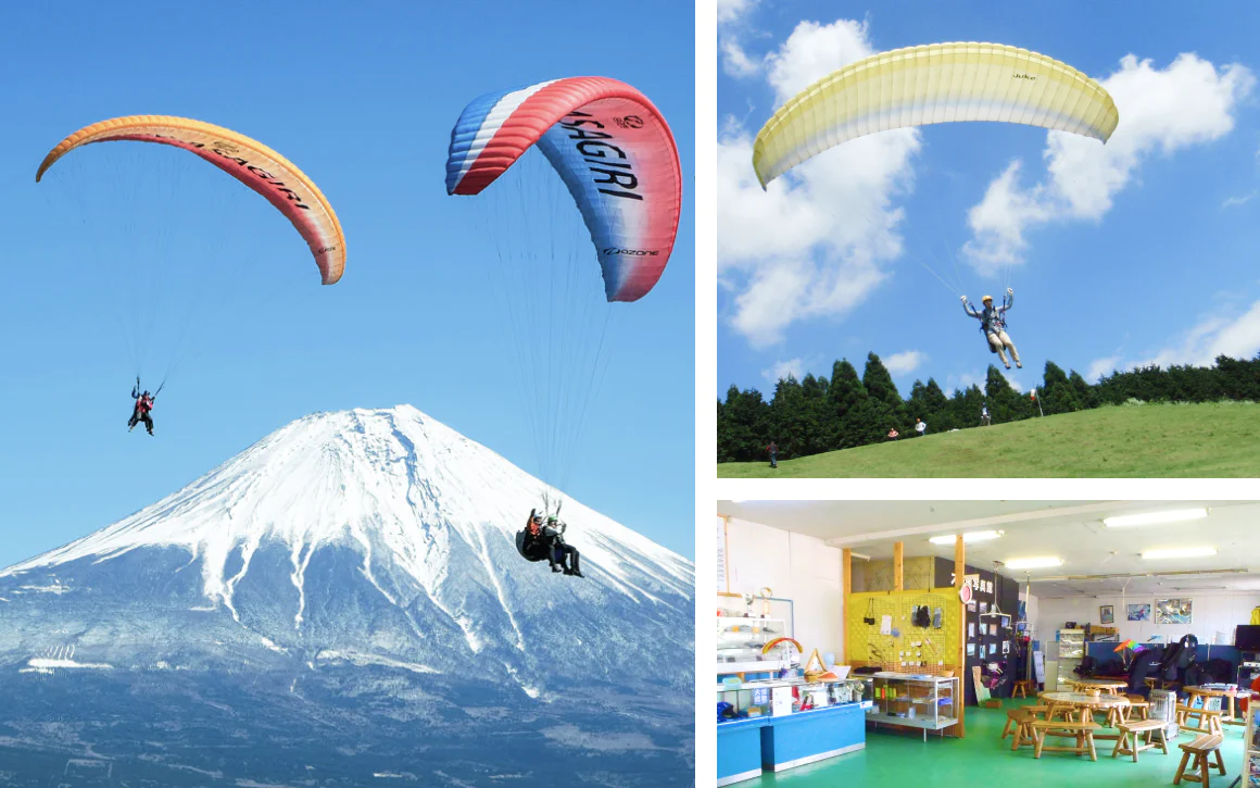 【澄み切った空気の中で、雲と同じ高さから富士山を眺めるパラグライダー体験】 高低差300mの高さをパラグライダーでフライトする絶景体験。眼下には朝霧高原の鮮やかな緑や街並みが広がり、目の前には雄大な富士山がそびえます。フライトはベテランインストラクターとの2人乗りなので、操作不要で誰でも参加OK! フライトはそれぞれで体験することになりますが、お互いの写真や動画を撮影したり、フライト後の感動をわかちあったりと、2人の思い出に残る非日常体験になります。