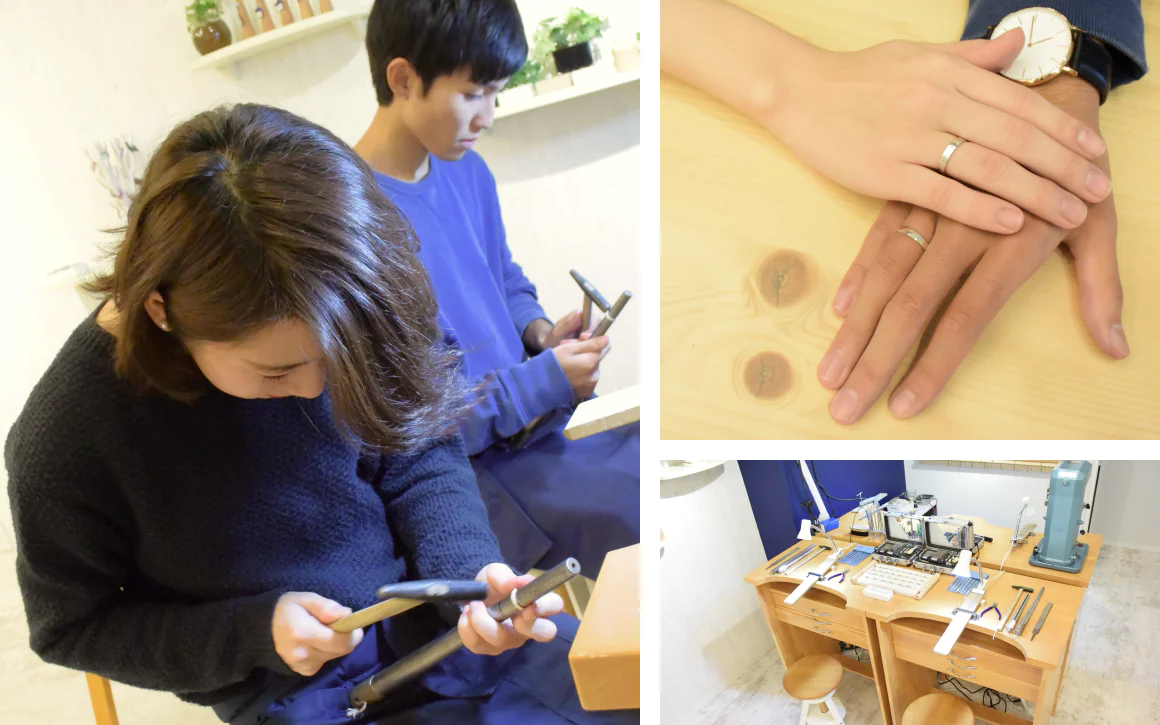 【職人のサポートで世界に一つだけのペアリングを作る】 世界に一つだけのシルバーリングを作れるシルバーリング作り体験。 ペアリングを作ったり、それぞれが思いを込めて作ったリングを交換したりと、二人にとって記憶にも形にも残る時間を過ごしていただける体験です。 モノづくり初心者の方も、職人がしっかりサポートしてくれるので完成度の高い作品を作っていただけます。