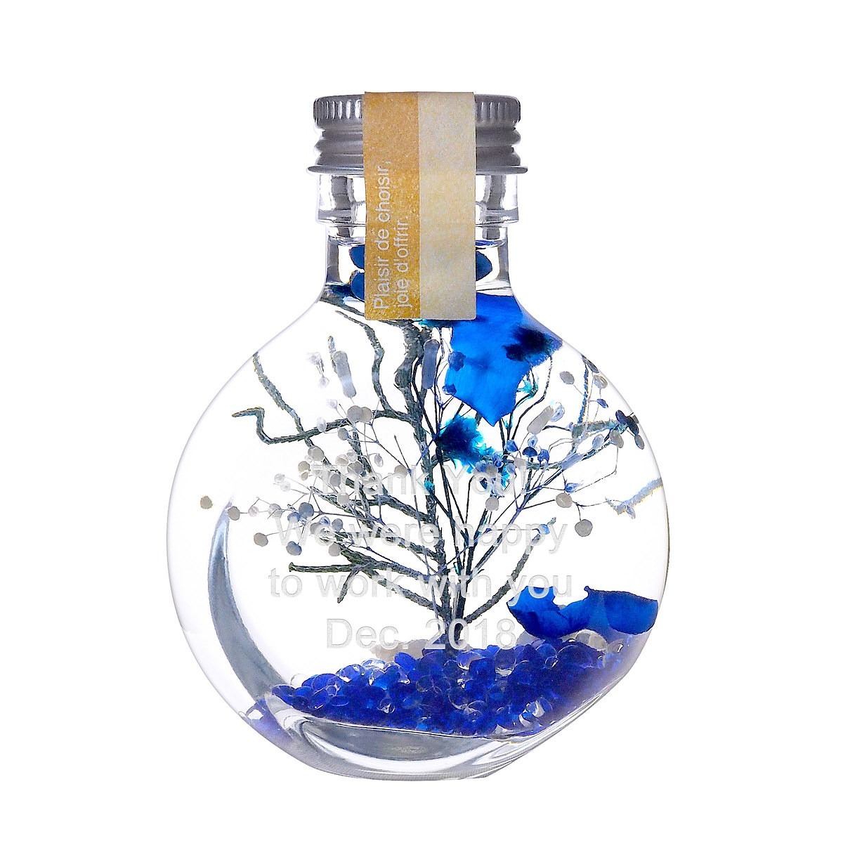 小さな瓶にブリザードフラワーを閉じ込めたハーバリウムです。生花と違ってお手入れもいらず、永久的に美しさが続きます。