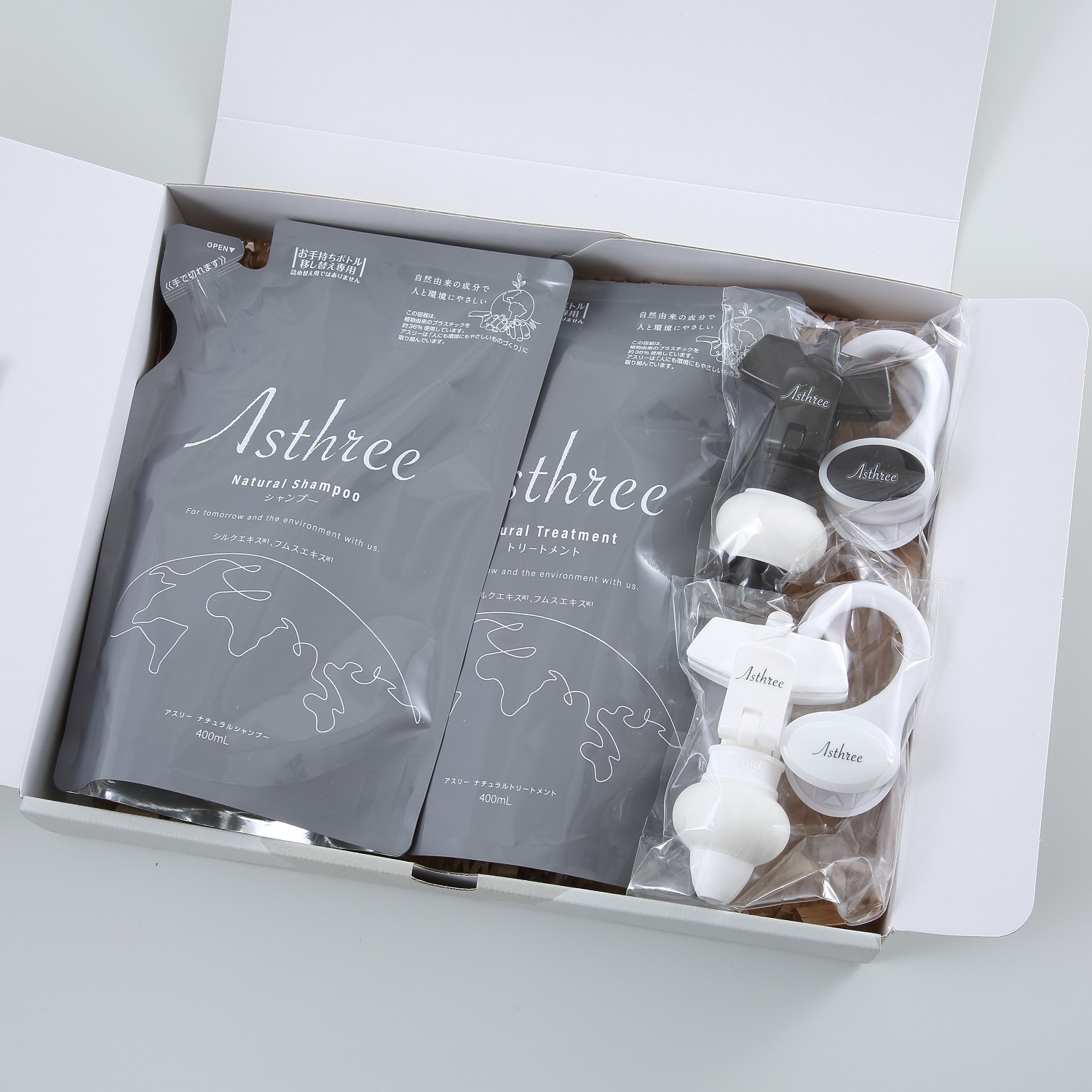 日々の生活用品を使いながら、SDGsに貢献できるブランド「Asthree(アスリー)」のシャンプー・トリートメントと「詰替えそのまま」のコラボギフトです。シャンプーもトリートメントもシリコンフリー。頭皮環境を整え、サラサラなのにしっとりとした美しい髪へ導きます。