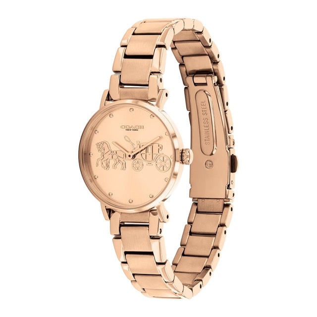 「COACH(コーチ)」の代表的なデザインでもある馬と馬車のモチーフを文字盤の中央に配置し、無駄のないシルエットが大人の魅力を引き立たせています。ローズゴールドカラーでゴージャス感を演出します。普段からお仕事などで時計を愛用されている方へのギフトにおすすめです。