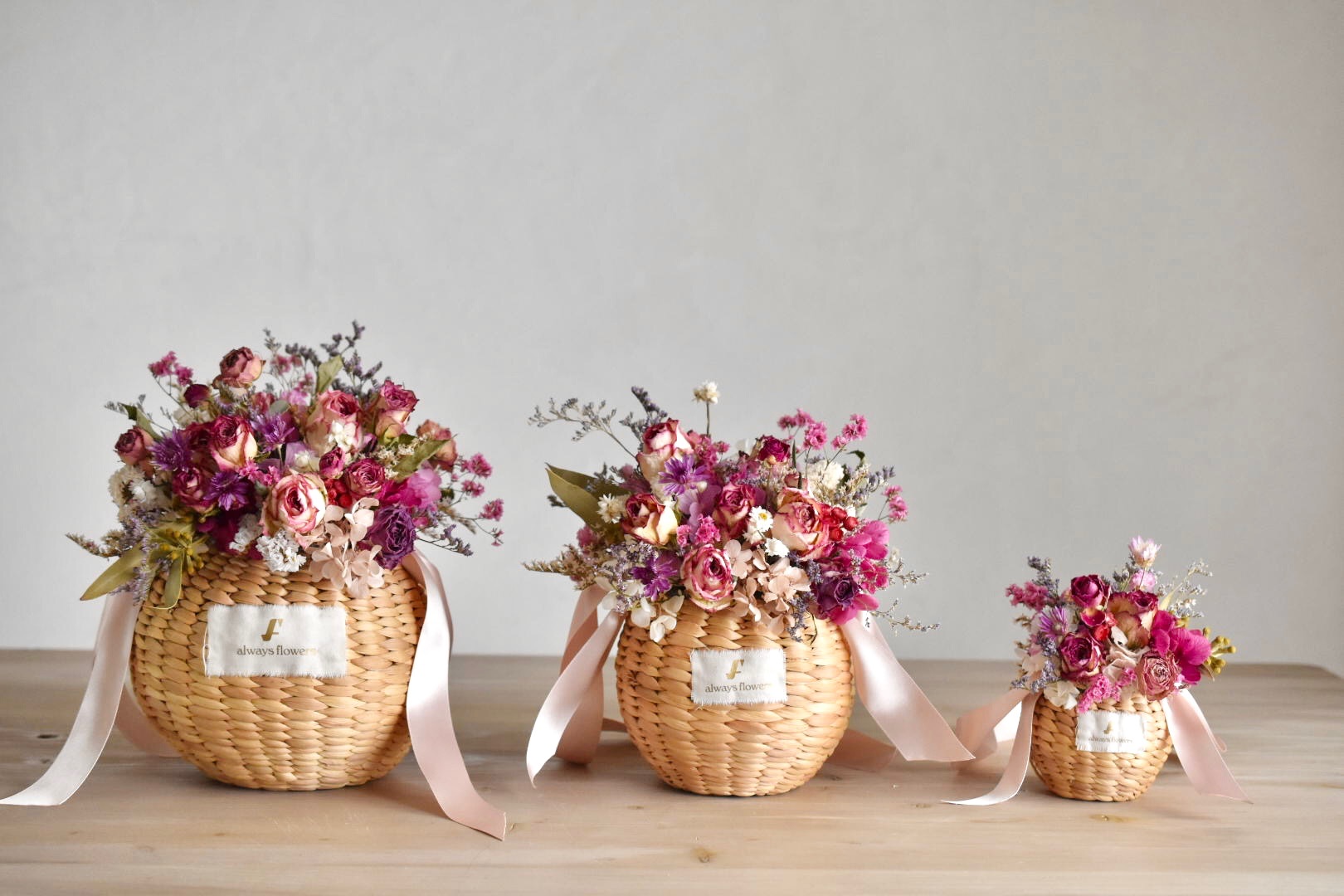 | 原材料 | カゴバッグ(ウォーターヒヤシンス)、ドライフラワー、プリザーブドフラワー |