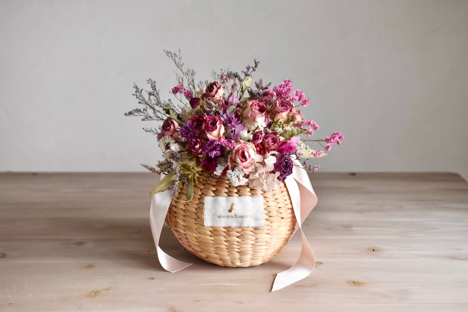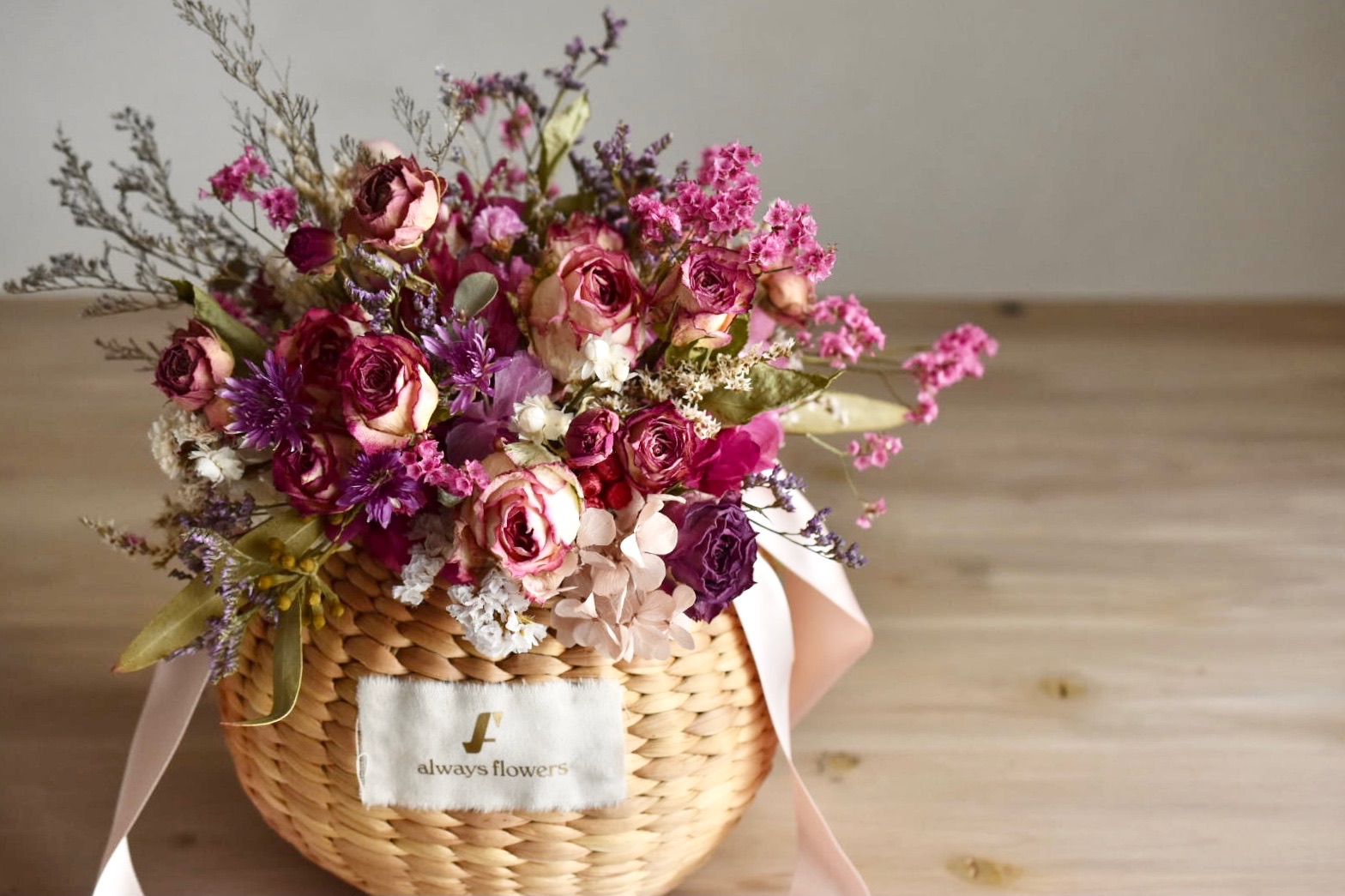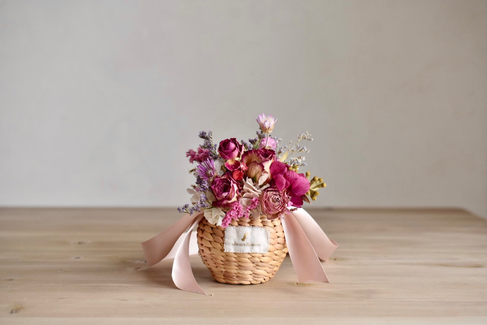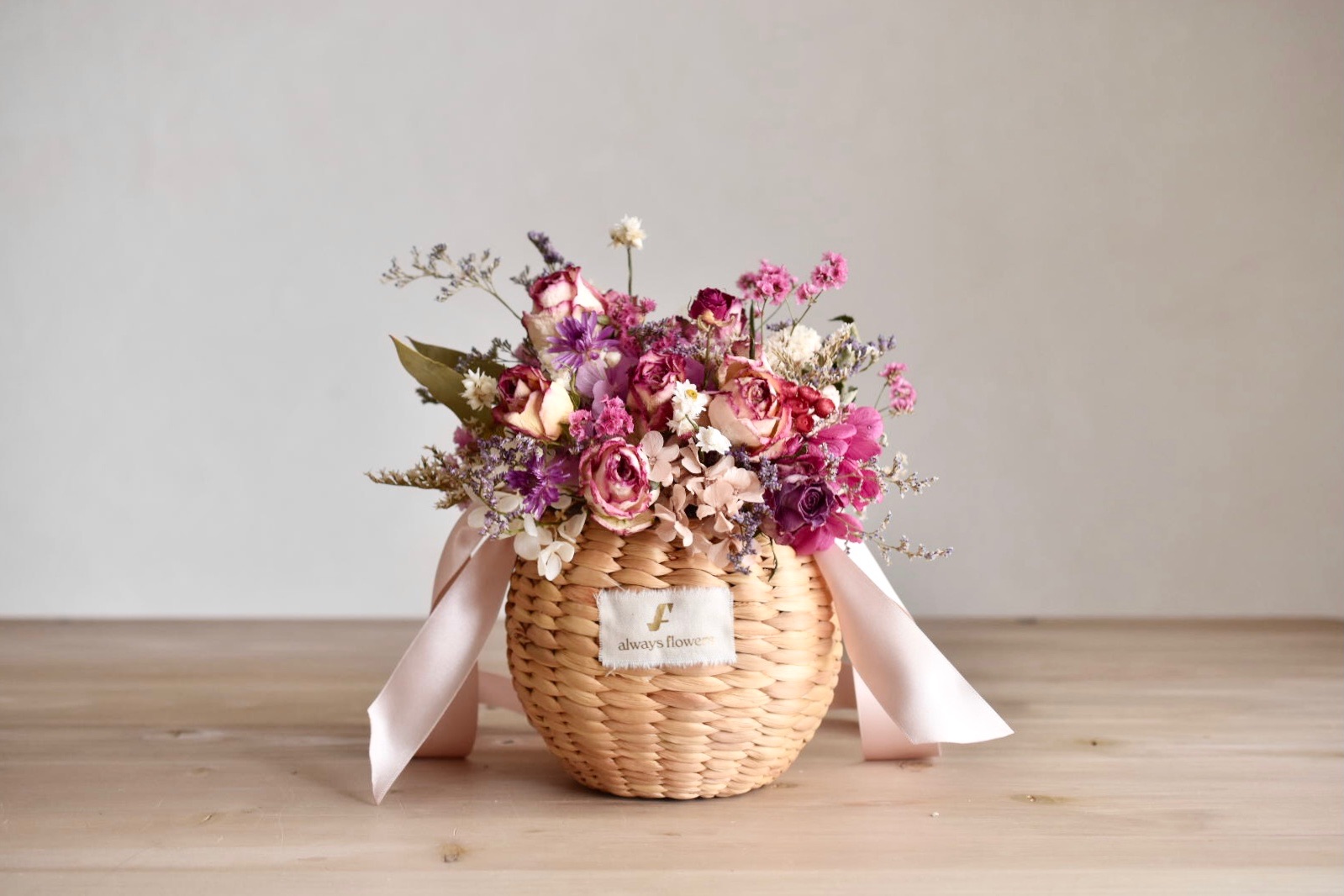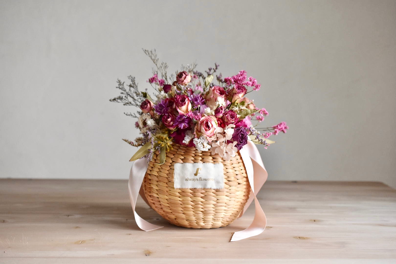 女性のココロがときめくフラワーアイテムを提案する「Always Flowers(オールウェイズ フラワーズ)」の、Flower BAG No.2 カゴバッグ(モデストローズ)です。ドライローズをメインに、カゴたっぷりにあしらった花々が華やかなフラワーバッグです。