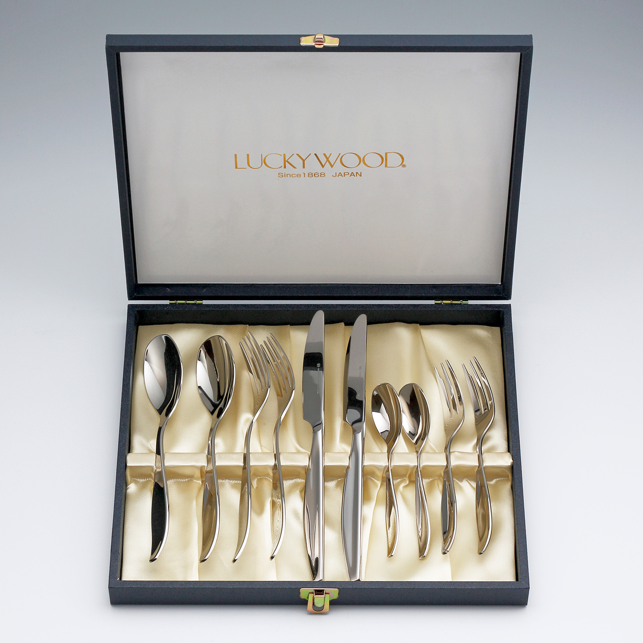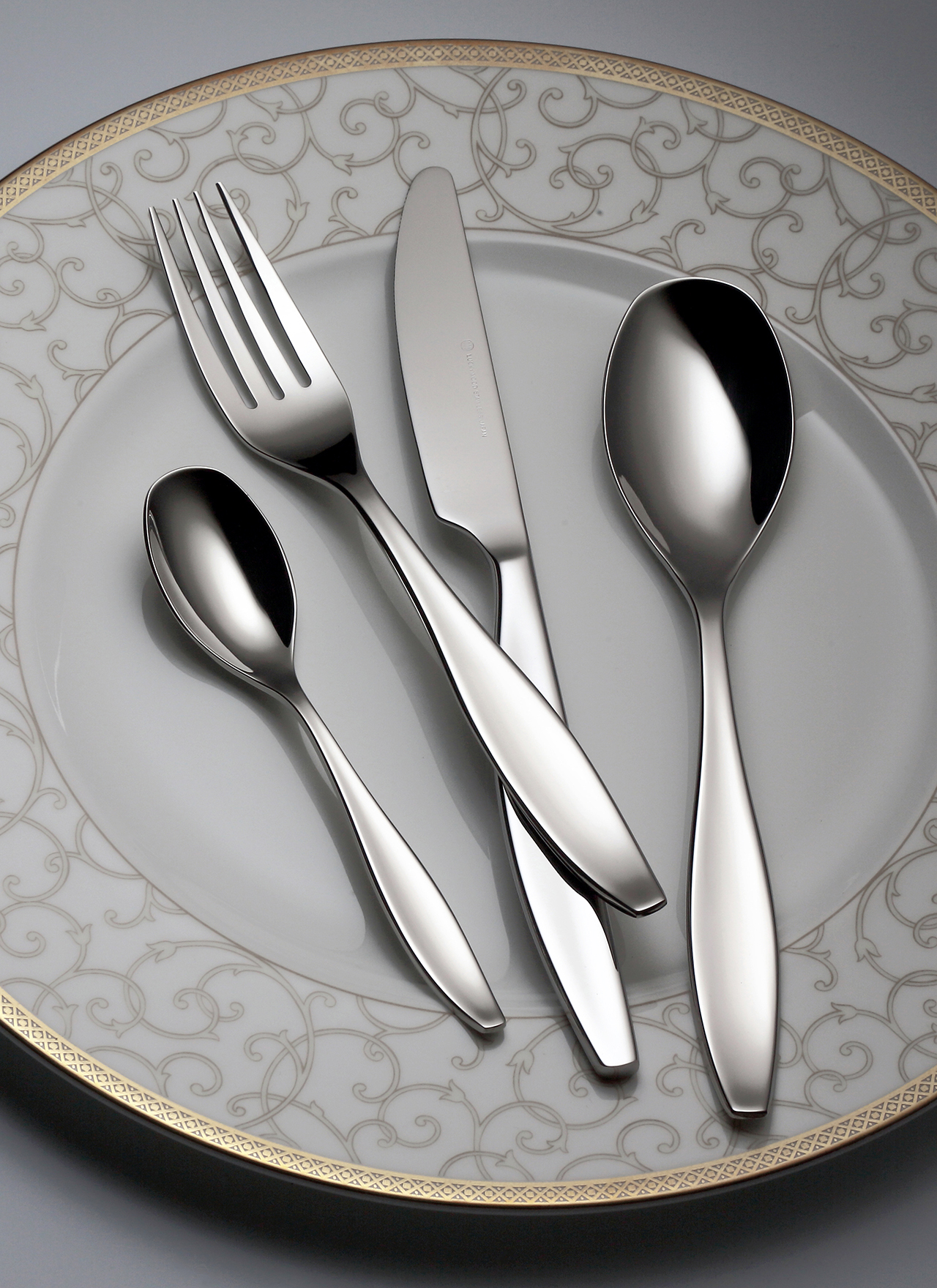 優美な曲線と側面の曲がりが特徴のカトラリーシリーズ。ハンドルに幅を持たせ、裏面に丸みを付けることで持ち易さや機能性を考慮しています。スプーン2種類、フォーク2種類、ナイフがセットになっています。ペアセットのため、引っ越し祝いの贈り物にもぴったりです。