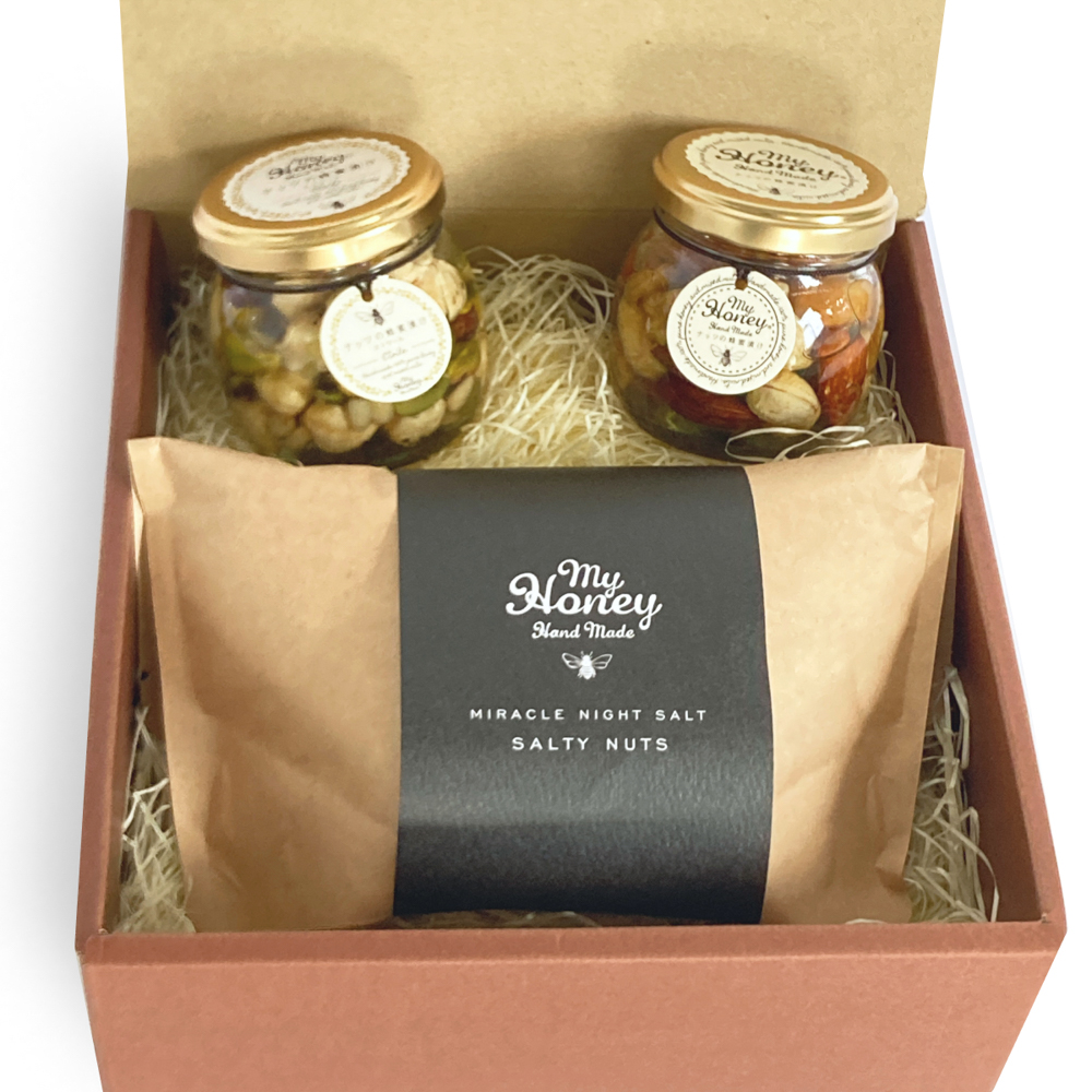 | 内容量 | ナッツのはちみつ漬け:90g×1個(製造日より1年6か月) ナッツのはちみつ漬けエトワール:90g×1個(製造日より1年6か月) ミラクルナイトソルト:250g×1個(製造日より5か月) |