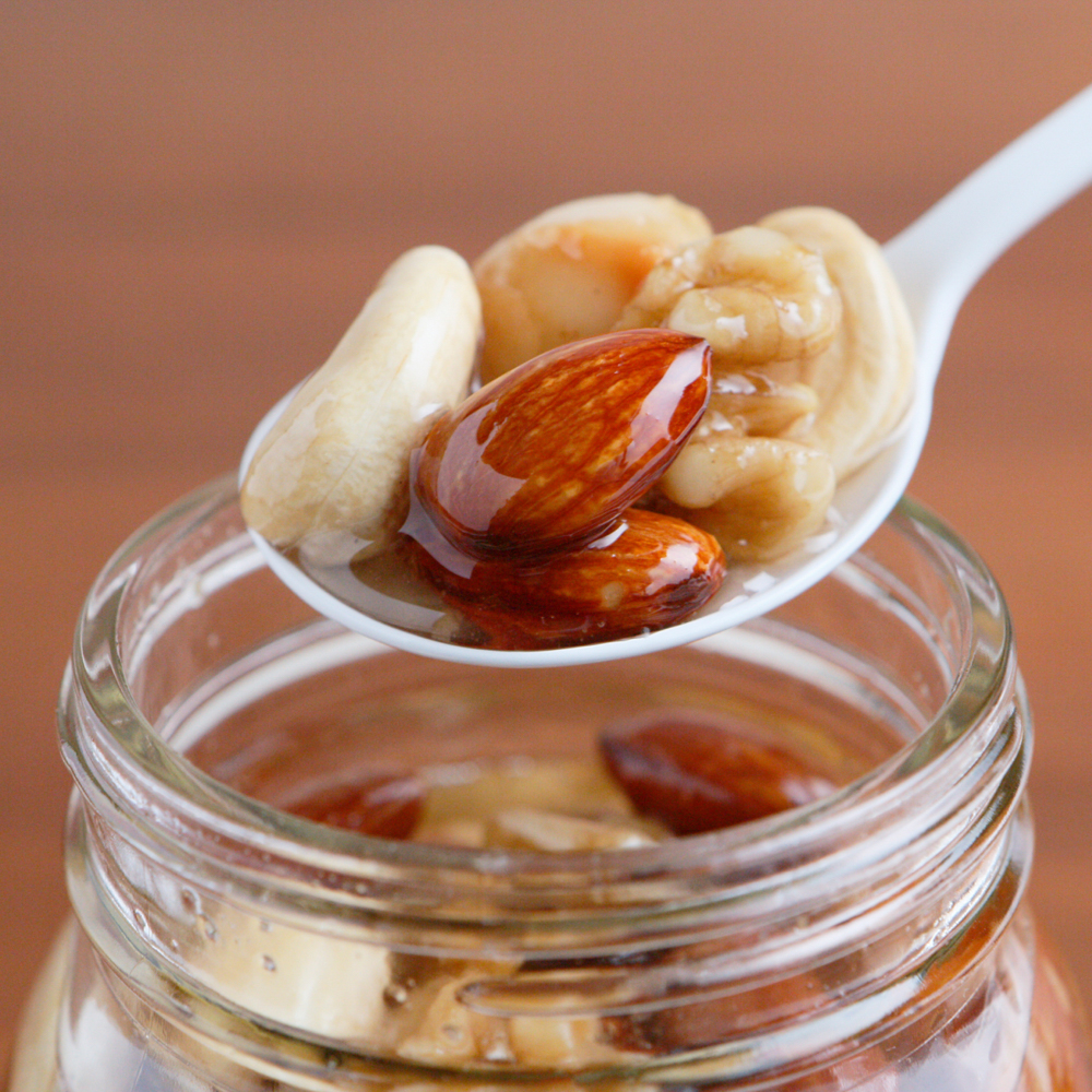 | 原材料 | 【ナッツのはちみつ漬け】 アカシアはちみつ(ハンガリー産)、アーモンド、カシューナッツ、くるみ、マカダミアナッツ 【ナッツのはちみつ漬けエトワール】 アカシアはちみつ(ハンガリー産)、ヘーゼルナッツ、ピスタチオ、アーモンド、有機パンプキンシード、黒コショウ 【ミラクルナイトソルト】 アーモンド・カシューナッツ・くるみ・マカダミアナッツ・植物油・ぬちまーす・赤穂の塩 |