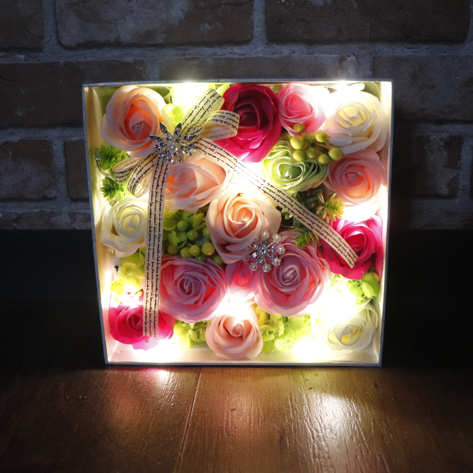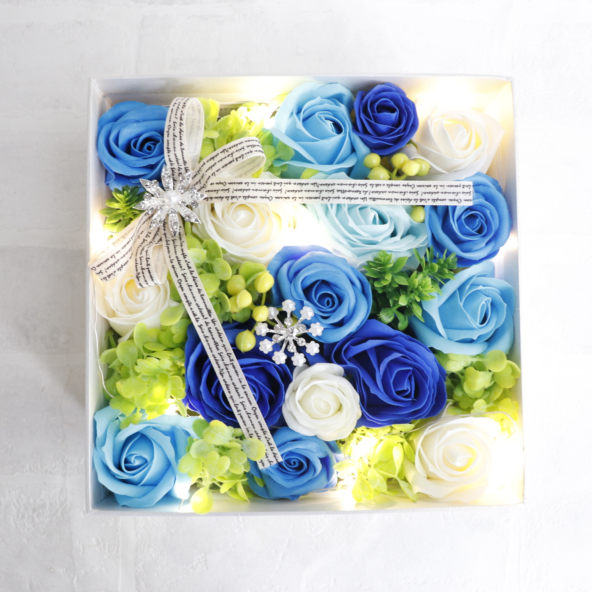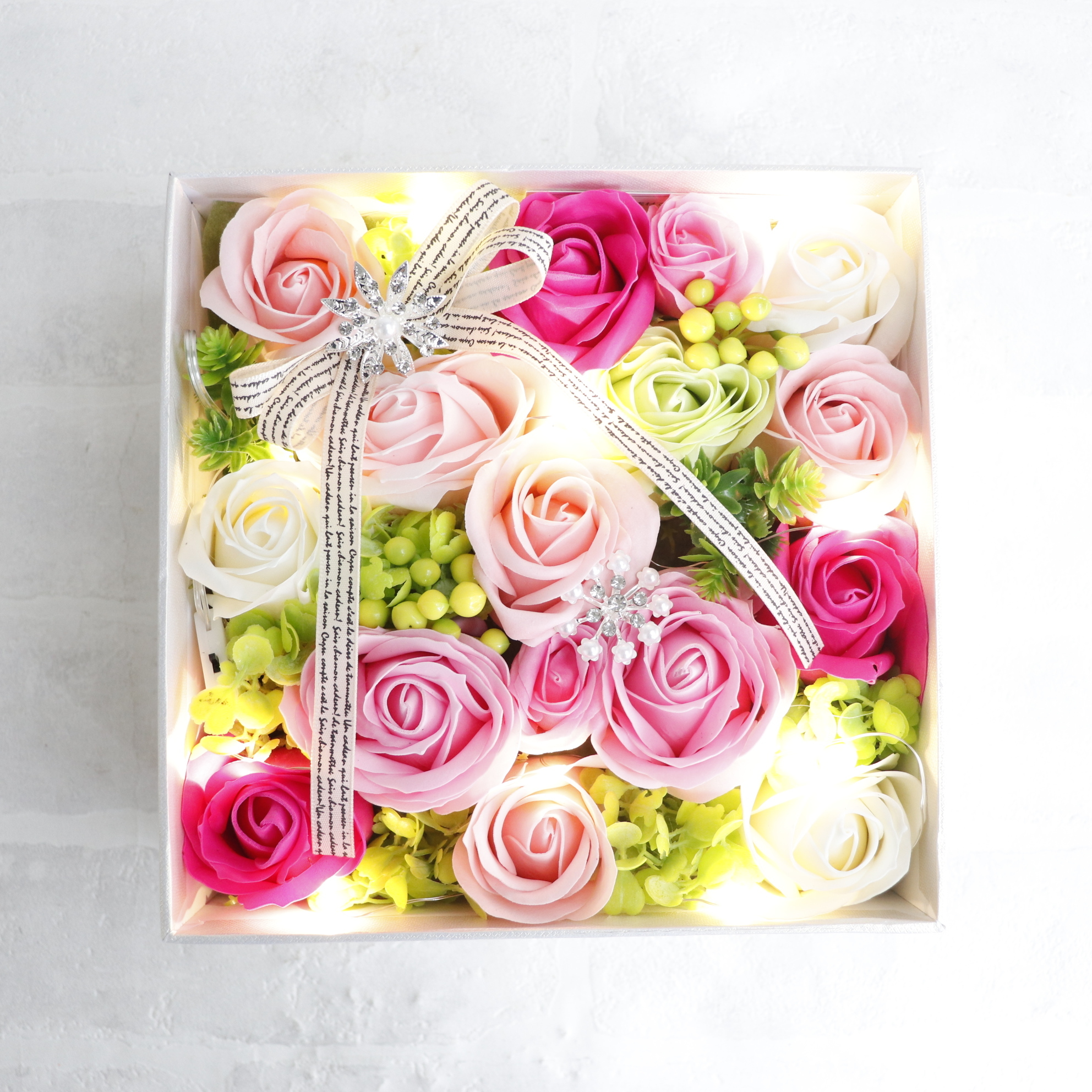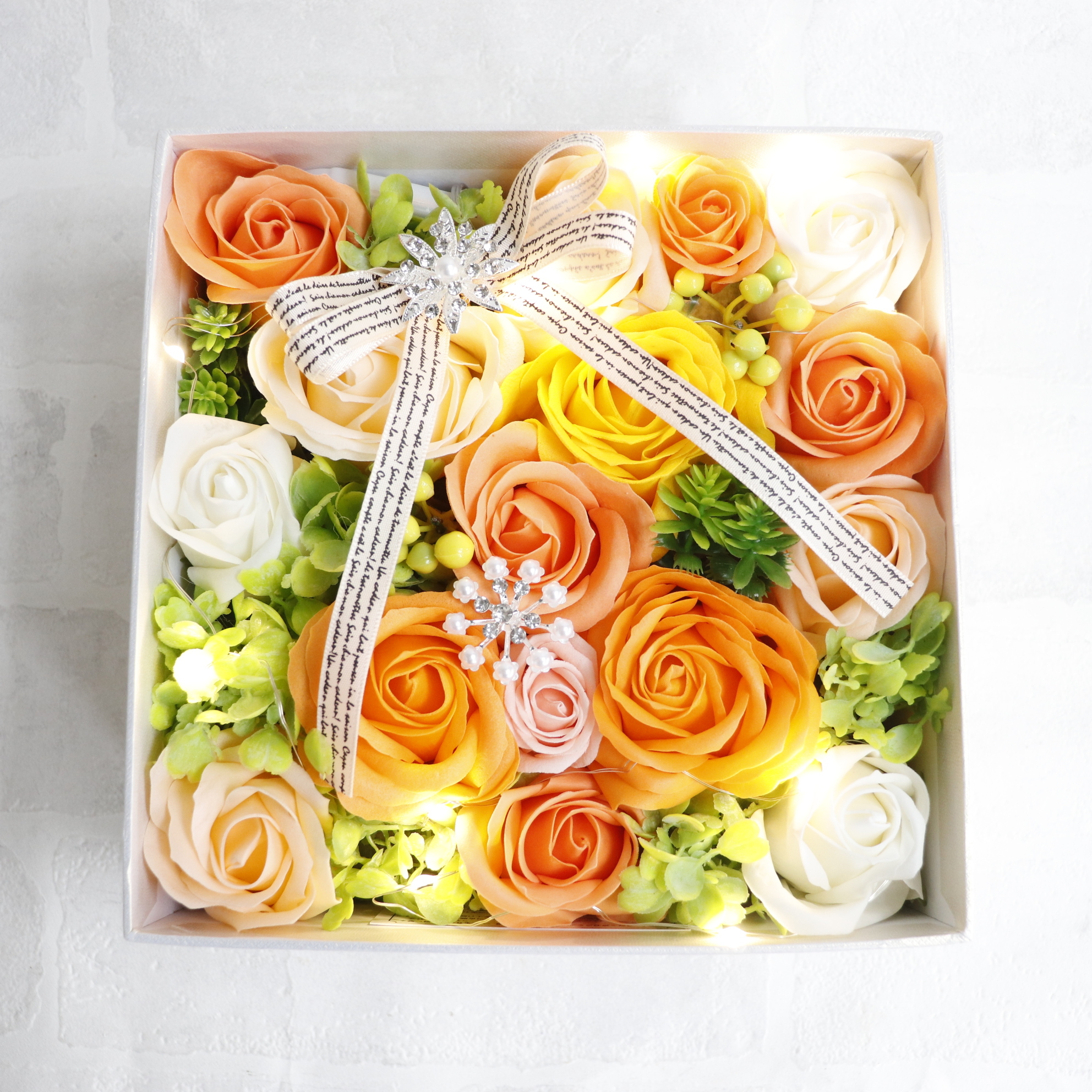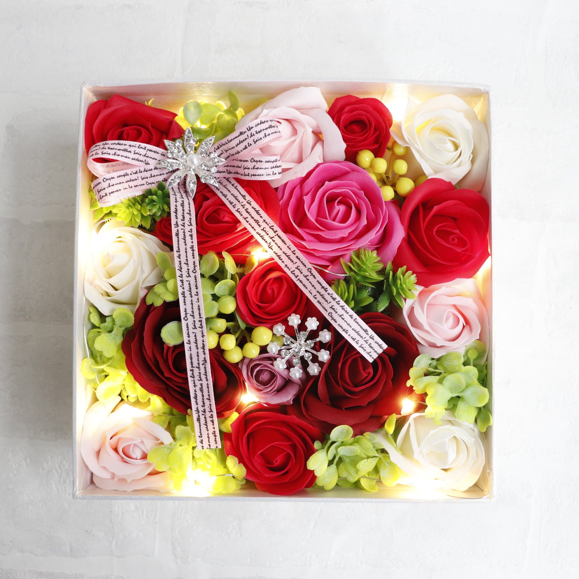 大口注文・法人のお問い合わせはこちら「karendo(カレンド)」がお届けする、ソープフラワーのギフト「LEDホワイトギャレBOX」です。お花がぎゅっと詰まったフラワーBOXに、LEDのライトを点けると幻想的な世界が広がります。 とっておきのプレゼントになるはず!見た目と香りを楽しめます。 蓋つきのBOXタイプです。