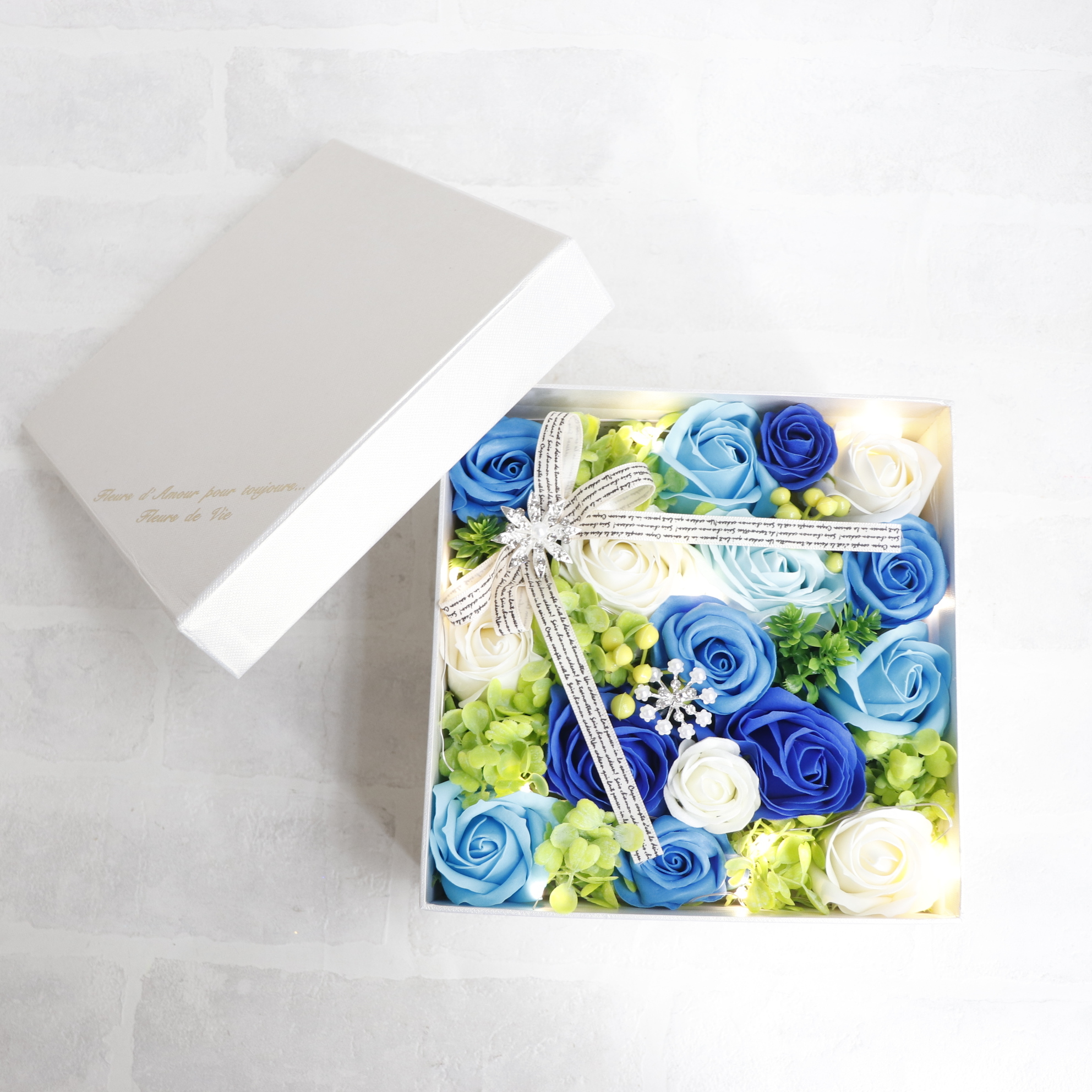 花と緑を通じてドキドキとワクワクを届ける「karendo(カレンド)」の、ソープフラワーのギフト「LEDホワイトギャレBOX」です。お花がぎゅっと詰まったフラワーBOXに、LEDのライトを点けると幻想的な世界が広がります。とっておきのプレゼントになるはず!見た目と香りを楽しめます。蓋つきのBOXタイプです。