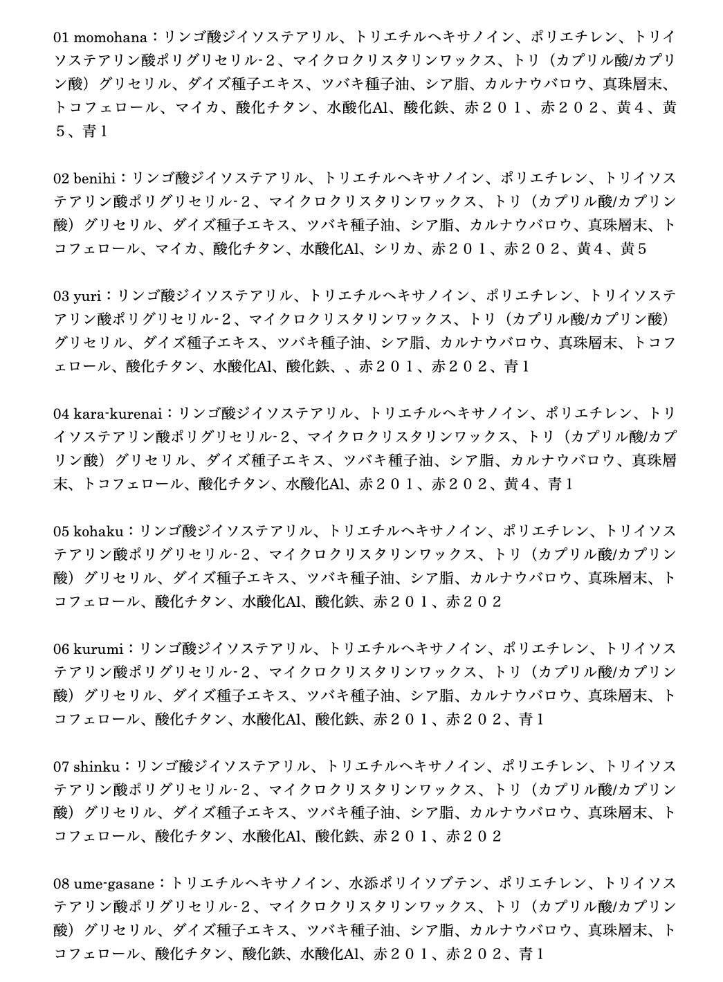 大口注文・法人のお問い合わせはこちら保湿効果とツヤを与えるためのツバキ種子油、美容成分として注目されているダイズ種子エキスを配合。 真珠層末でなめらかな触感を引き出し、使うほど皮むけを抑えて唇をなめらかに。 ダイズ種子エキスは、みずみずしくふっくらとした印象に導いてくれます。
