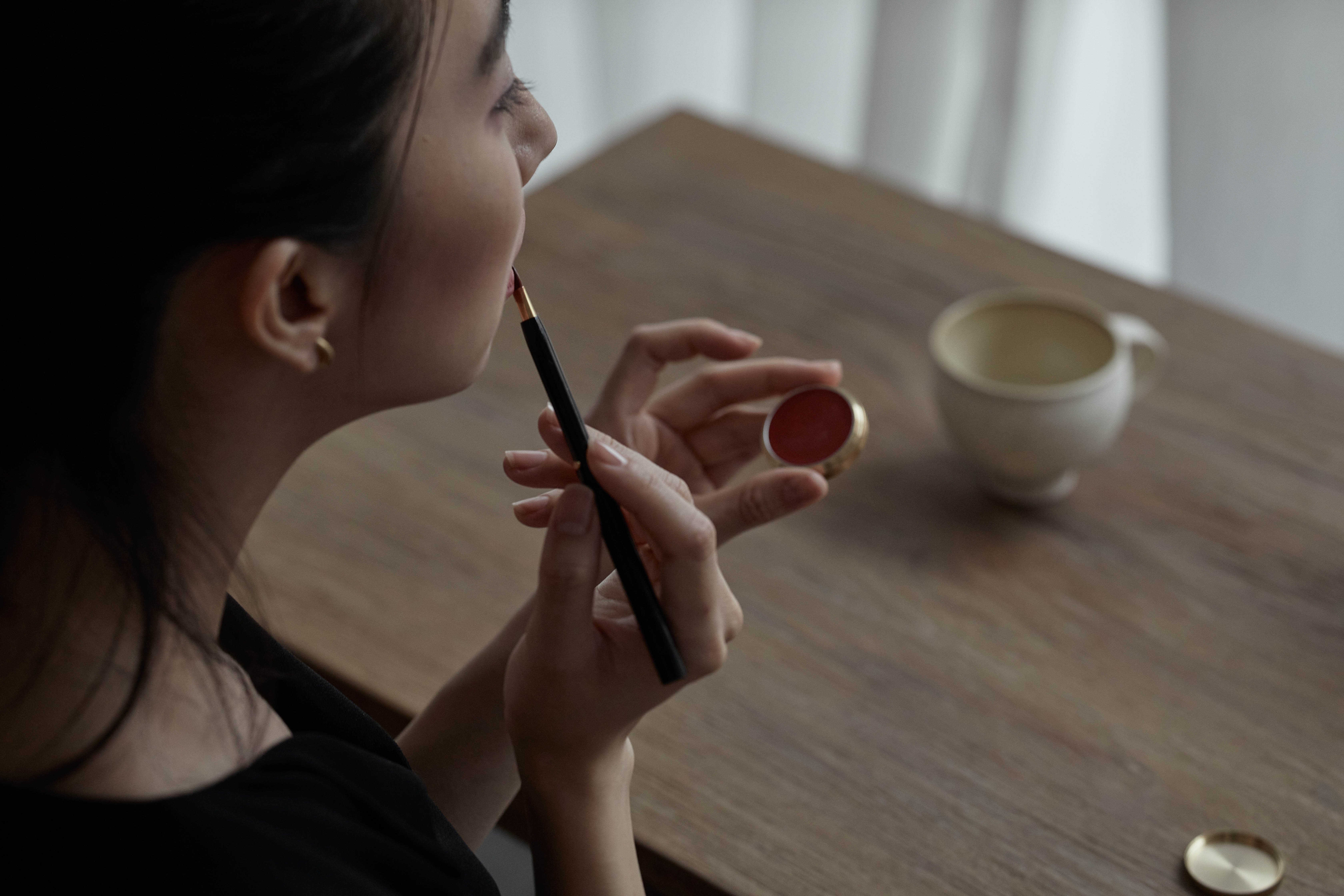 しっかりと発色させたいときは、紅筆をご使用ください。 紅を筆によく含ませることで、ムラがなくなり一筆で美しく仕上げることができます。 ほんのりと発色させたいときは、紅さし指の体温でじんわりと紅を溶かし、唇中央から広げてあげると、ふんわりと仕上がります。