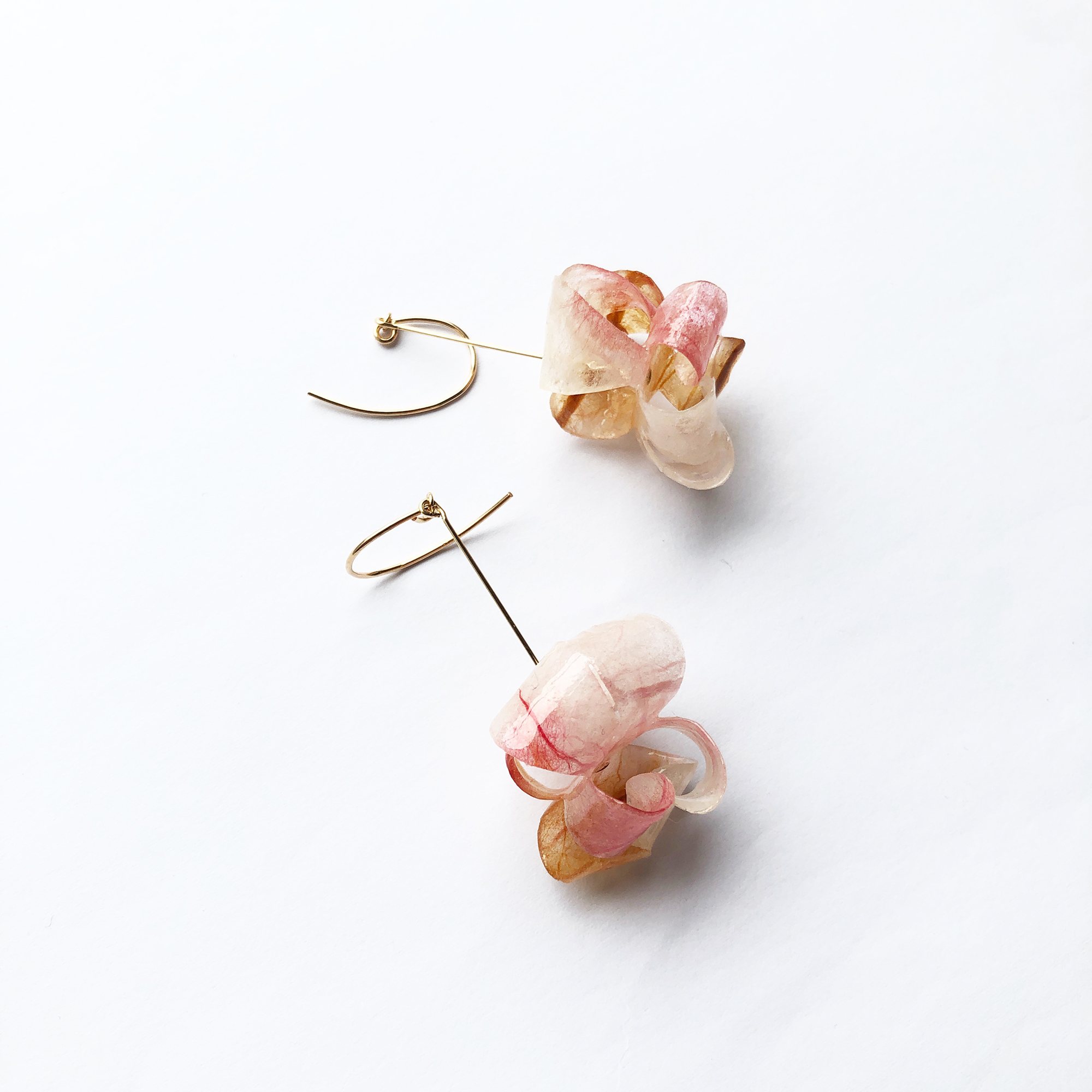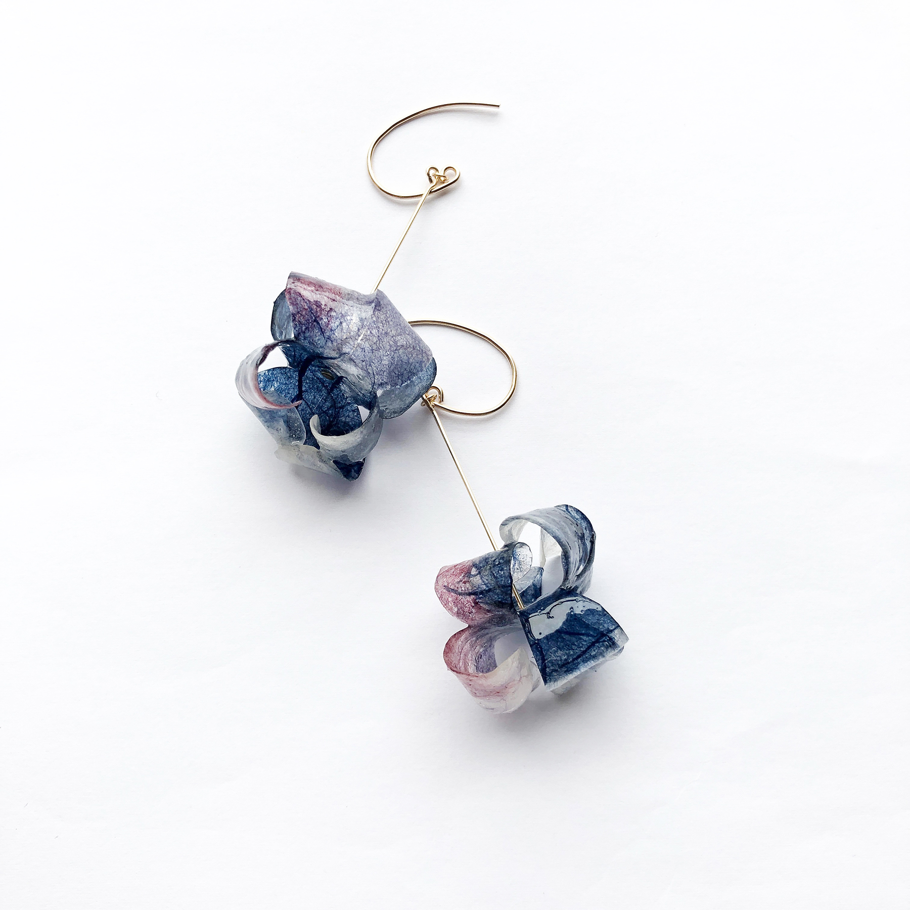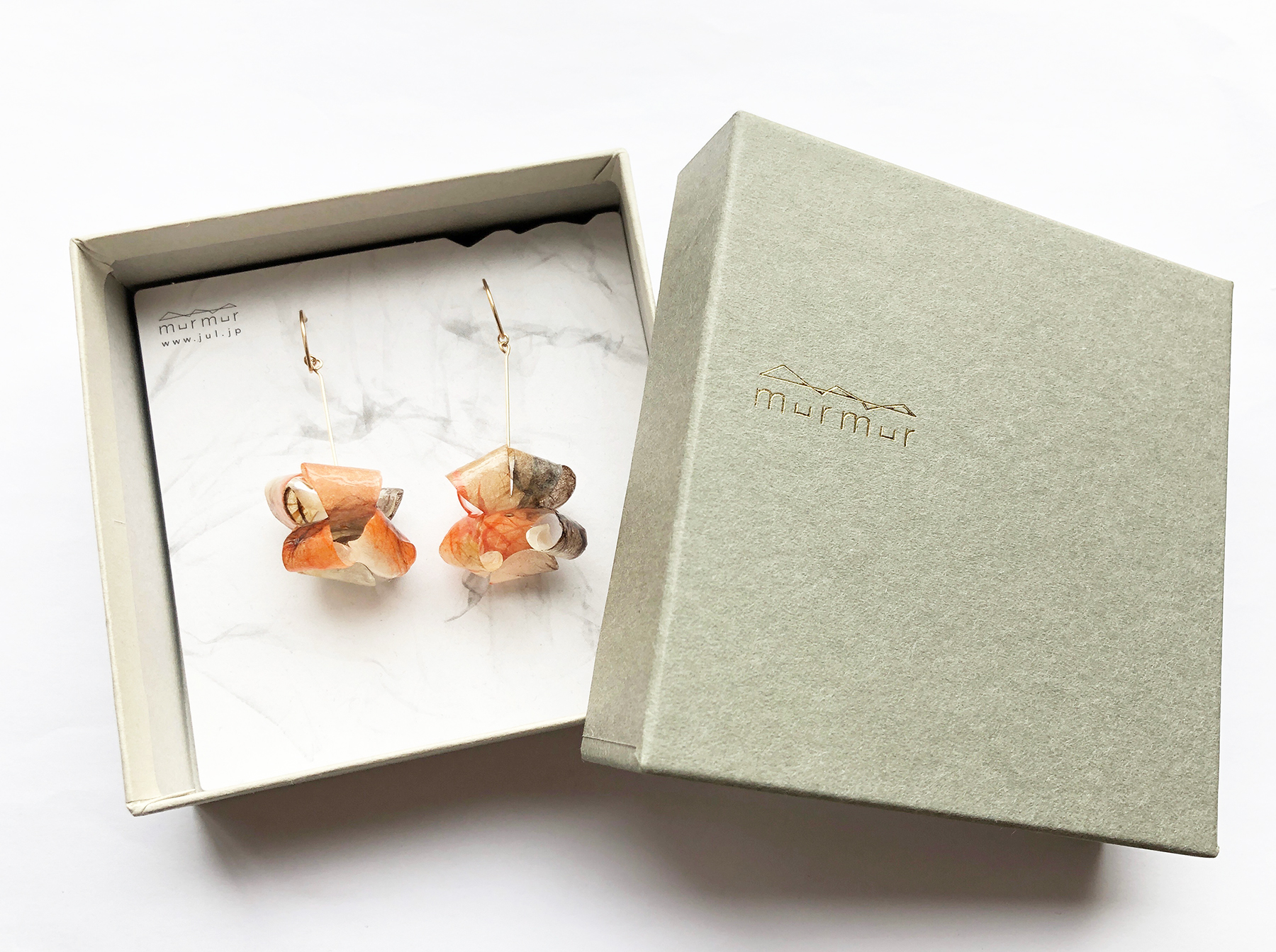 和紙のアクセサリーブランド「murmur(マーマー)」の1300年の歴史ある石川県の伝統工芸「二俣和紙」を用いたアクセサリーです。染めてから形作り、樹脂を含浸させて固めています。不安定な一瞬を切り取ったような形状と独特な透け感が特徴。ふわりと軽く光をはらんで輝きます。