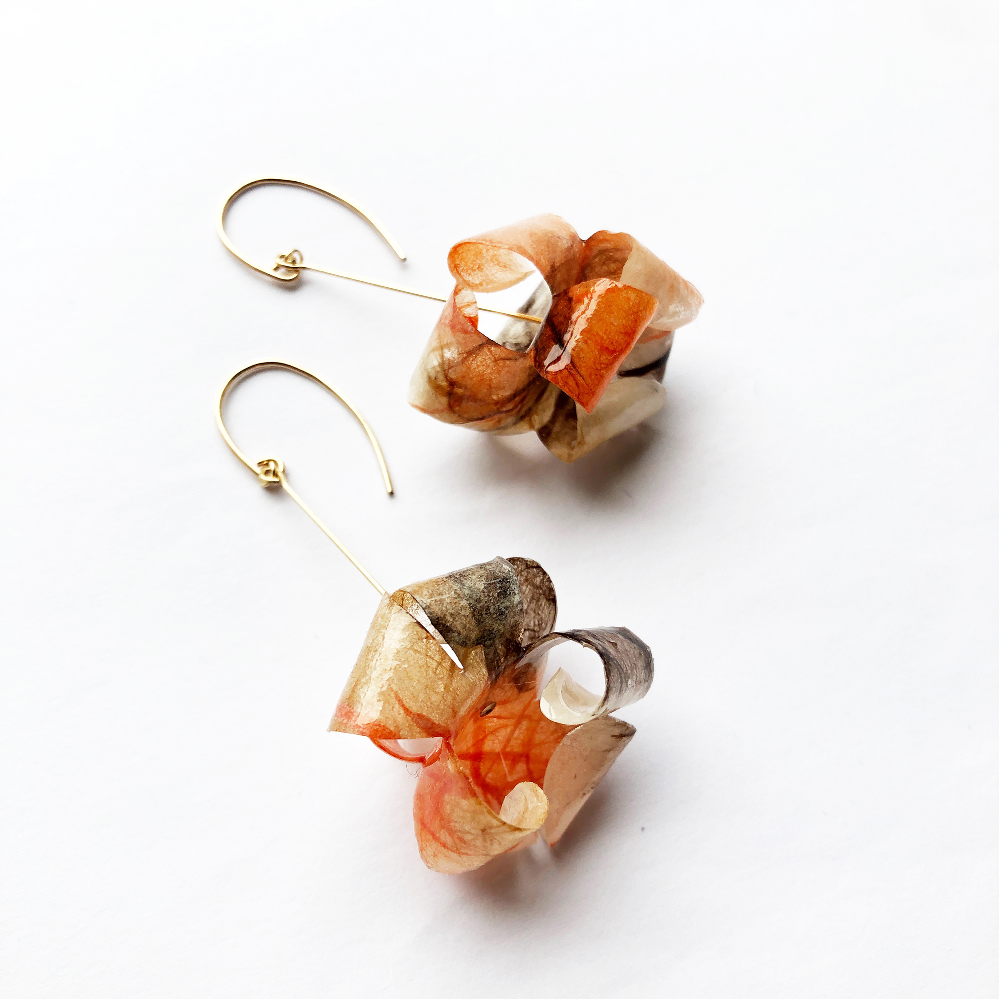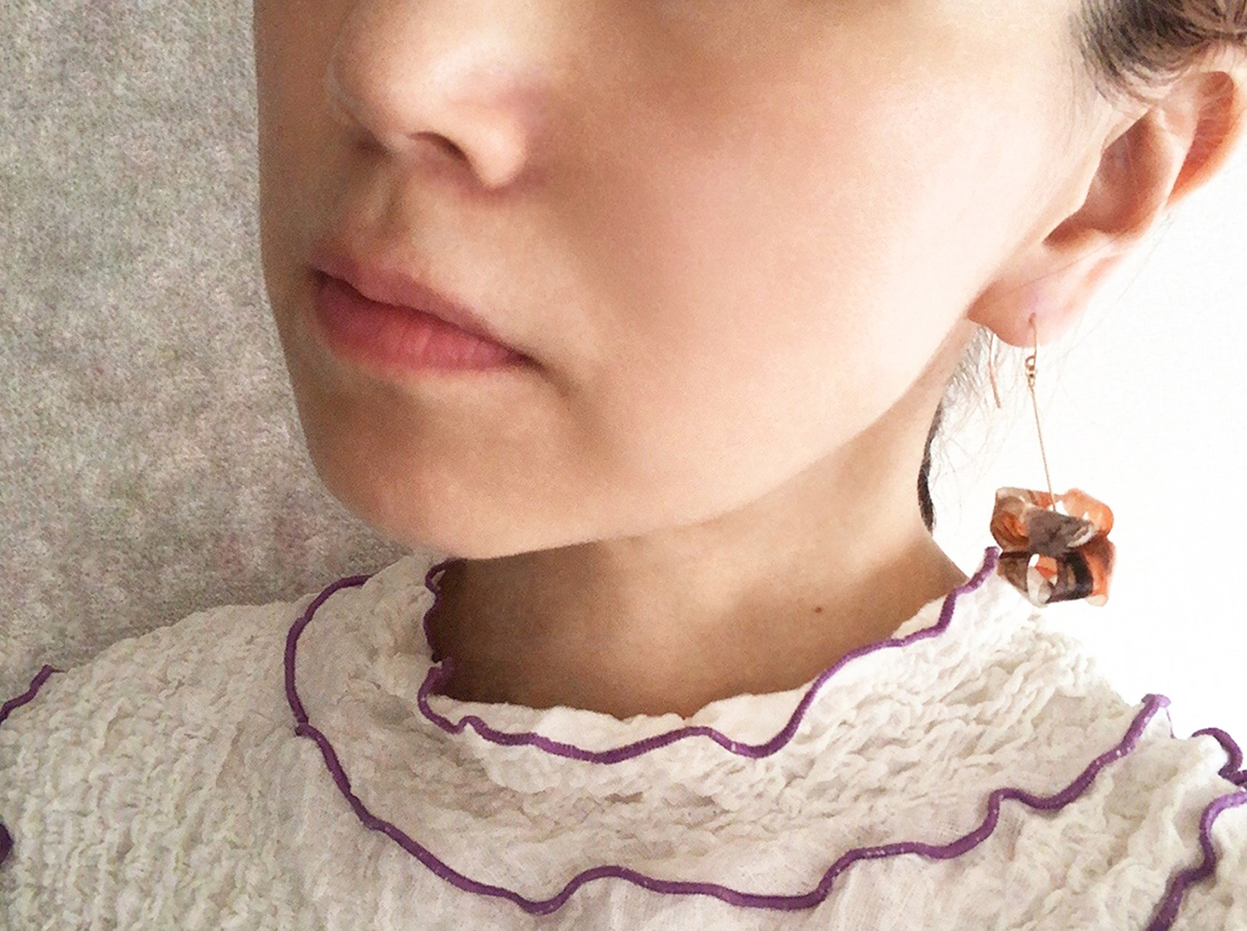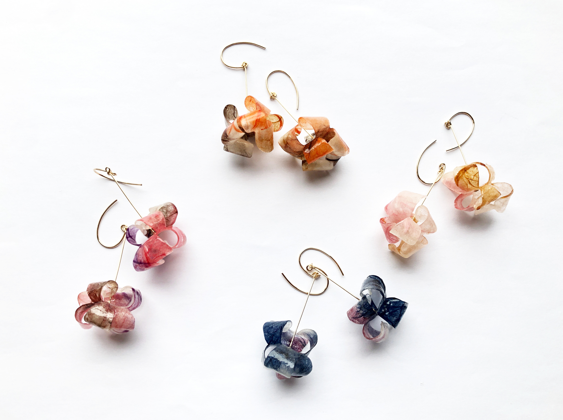 和紙のアクセサリーブランド「murmur(マーマー)」の1300年の歴史ある石川県の伝統工芸「二俣和紙」を用いたアクセサリーです。染めてから形作り、樹脂を含浸させて固めています。不安定な一瞬を切り取ったような形状と独特な透け感が特徴。ふわりと軽く光をはらんで輝きます。