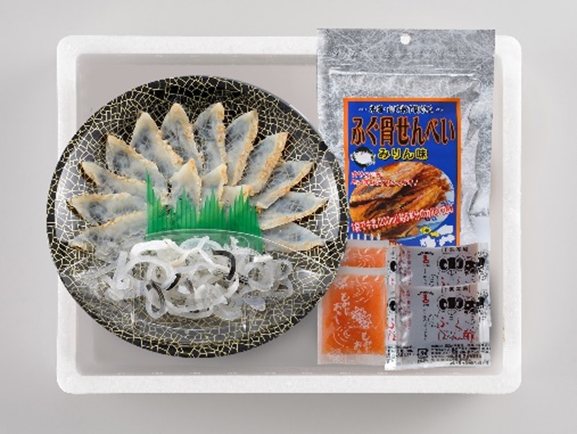 | 内容量 | 真ふぐたたき刺身(プラ皿)20g、とらふぐ皮30g、ふぐ骨せんべい(みりん味)30g、ふくポン酢10g×2、もみじおろし10g×2 |