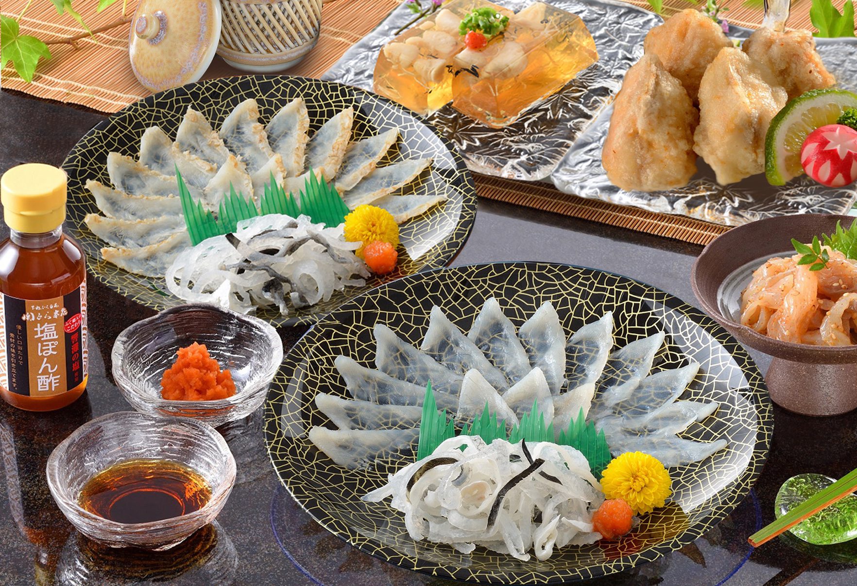 | 素材 | 塩ポン酢[醸造酢(国内製造)、果糖ぶどう糖液糖、発酵調味料、食塩、砂糖、かつおエキス、柚子果汁、しょうゆ、こんぶエキス]、ふぐ煮こごり[シロサバフグ切身、しょうゆ、トラフグ皮、ゼラチン加工品(ゼラチン、乳糖、その他)、砂糖、食塩、かつお調味料、昆布調味料]、ふぐ唐揚げ(油調済)[シロサバフグ(福岡、長崎県産)、醤油、食塩、衣(でん粉、小麦粉、パン粉、砂糖、食塩、植物性たん白、香辛料)]、トラフグ(長崎、熊本県産:養殖)、とらふぐ塩辛[トラフグ(国産)、味醂、ごま、食塩、はちみつ、唐辛子]、マフグ(山口県産)、ふくポン酢[醤油、柑橘果汁(橙、かぼす)、醸造酢、米発酵調味料、かつおエキス、昆布エキス、食塩]、もみじおろし[大根、澱粉、唐辛子、こんにゃく粉、梅酢]/調味料(アミノ酸等)、ゲル化剤(ジェランガム)、香料、アルコール、酸味料、ビタミンB1、加工でん粉、pH調整剤、トレハロース、増粘剤(グァーガム、キサンタンガム)、グルコマンナン、(一部に小麦・乳成分・ごま・さば・大豆・ゼラチンを含む) |