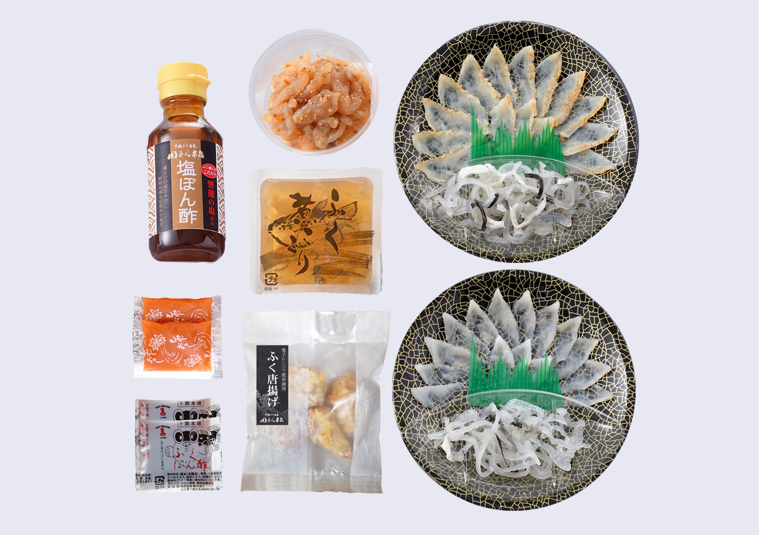 | 内容量 | とらふぐ刺身(プラ皿)15g、真ふぐたたき刺身(プラ皿)20g、とらふぐ皮30g×2、ふぐ煮こごり100g、ふぐ唐揚げ(油調済・骨付)80g、とらふぐ塩辛(カップ)60g、塩ポン酢100ml、ふくポン酢10g×2、もみじおろし10g×2 |