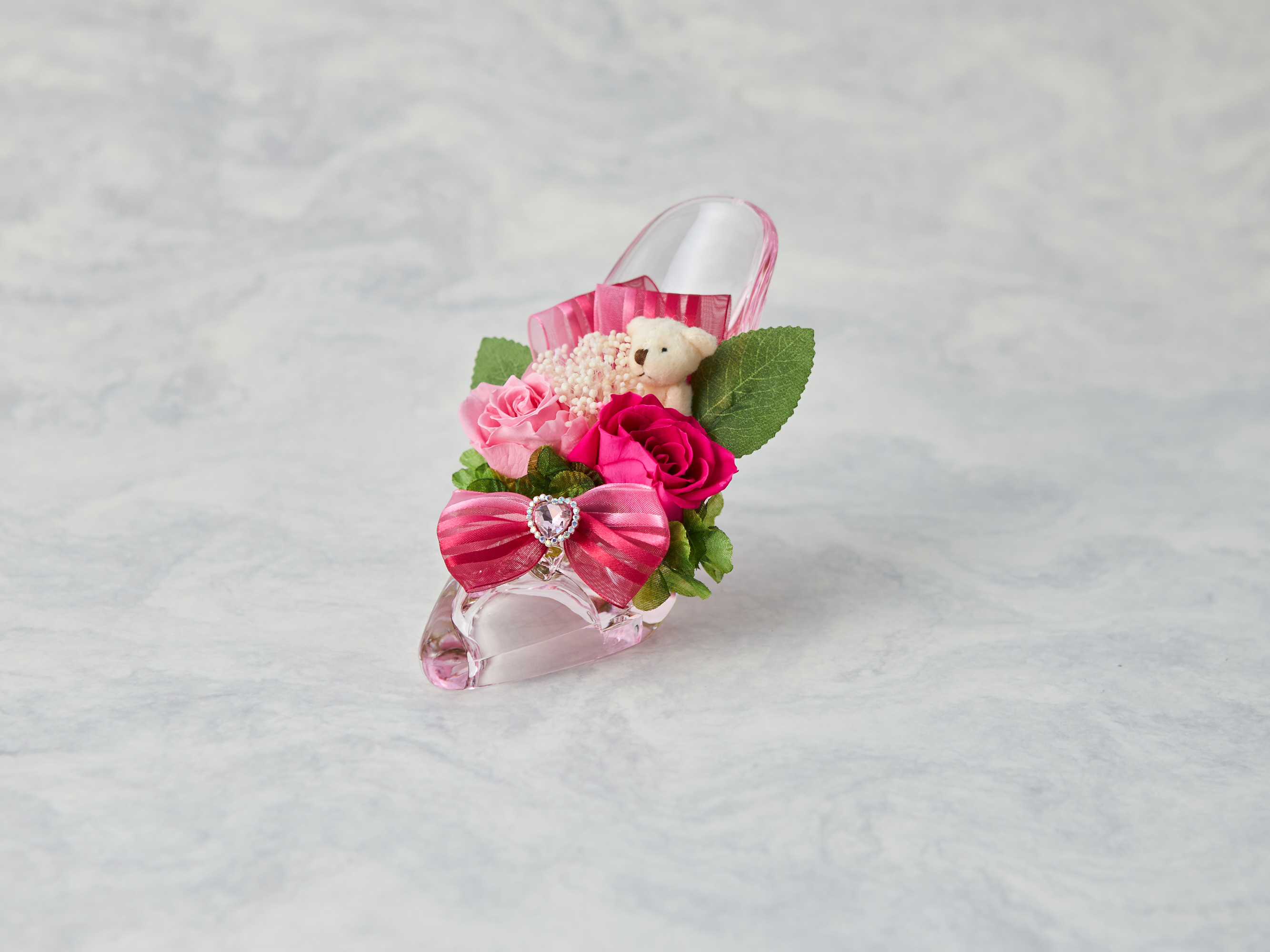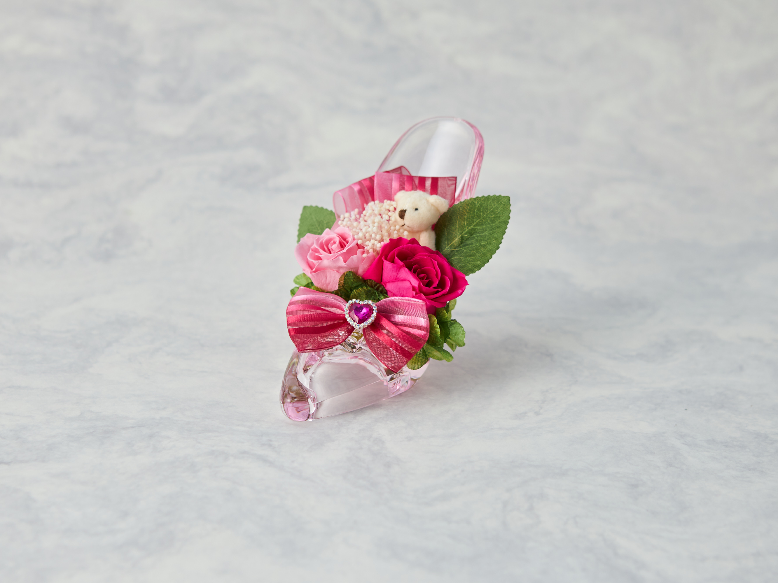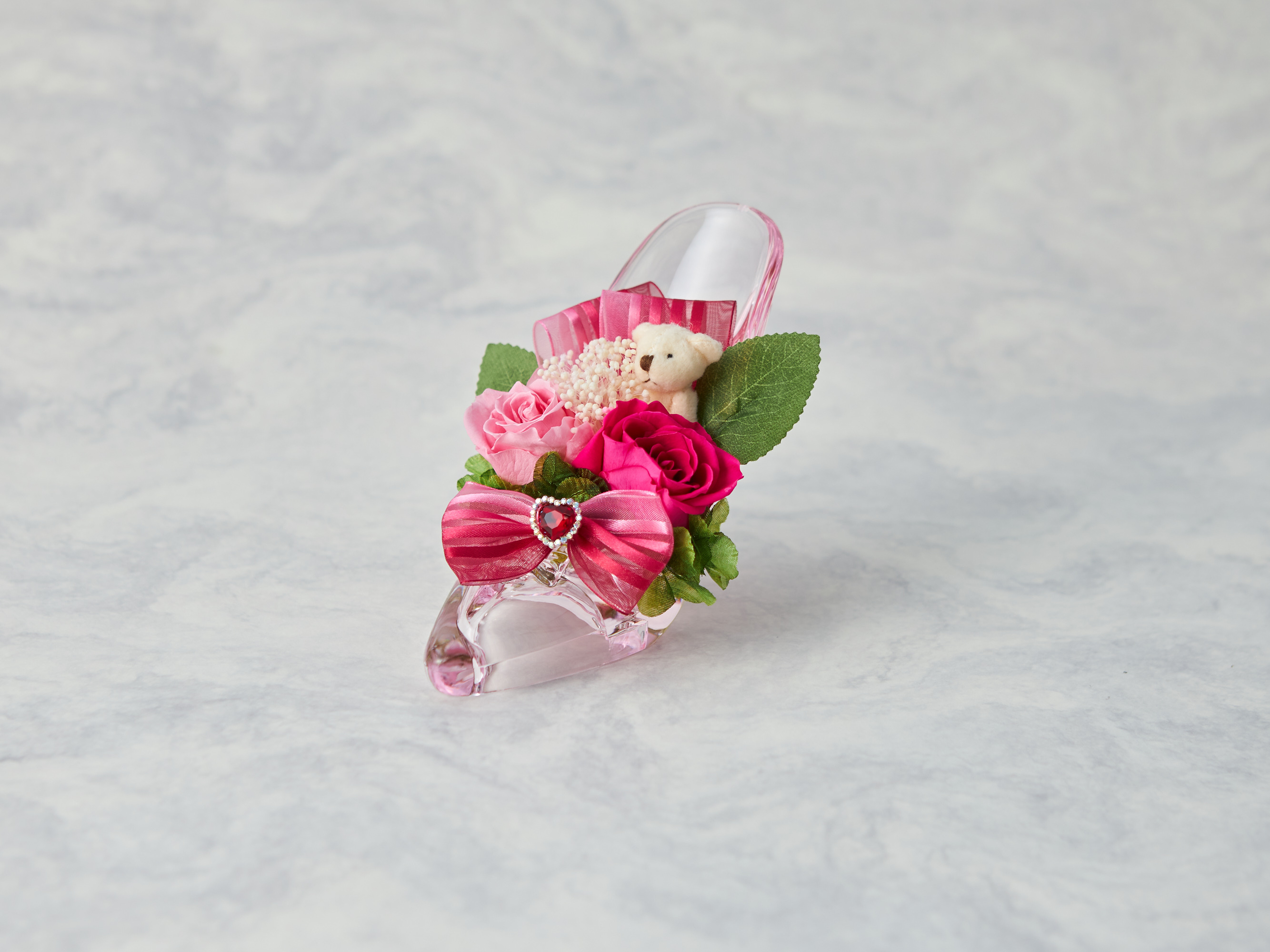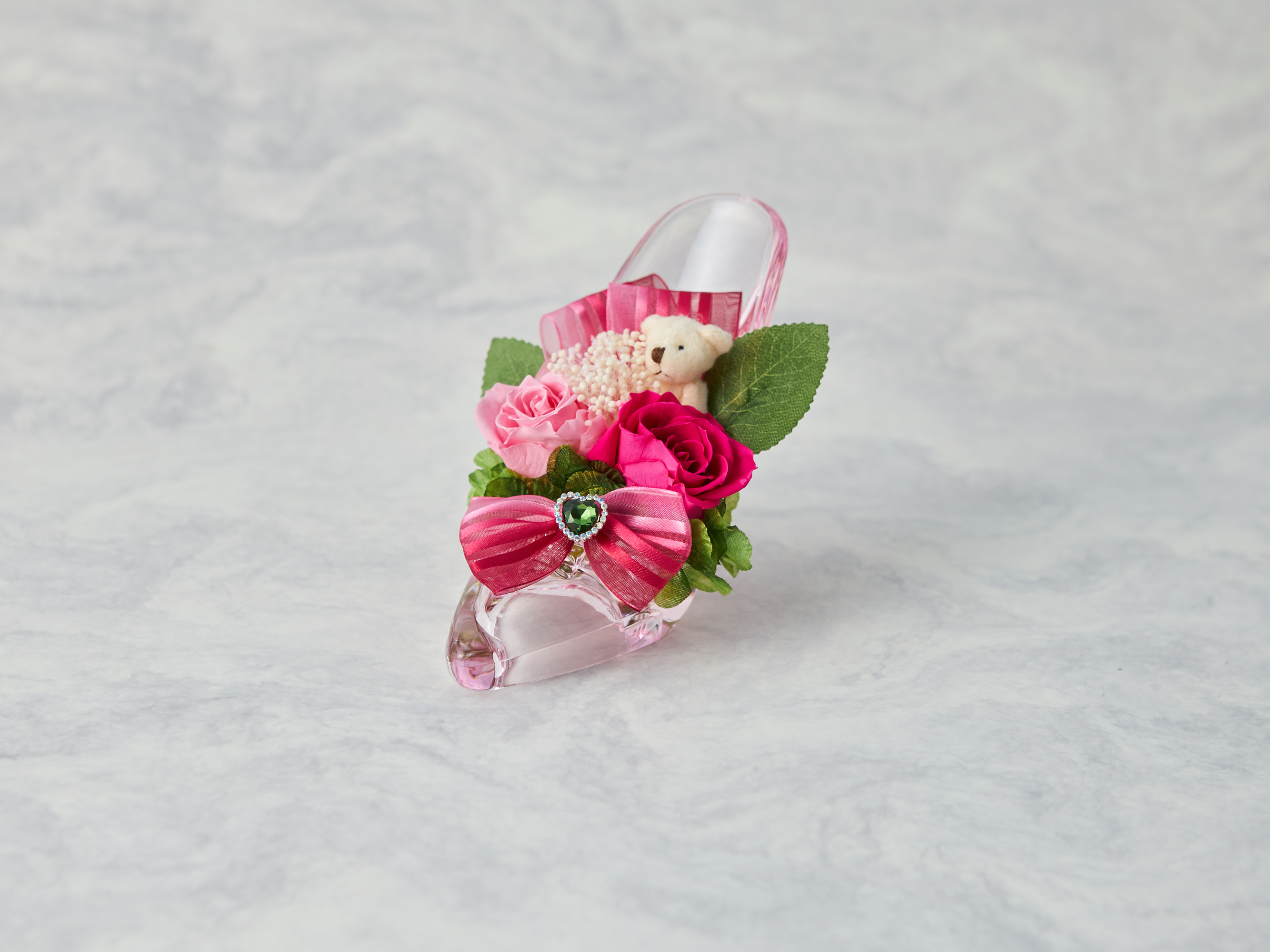 きらめくガラスの靴には、赤やピンクのバラのプリザーブドフラワーが上品にデザインされています。グラデーションカラーのリボンにハートのビジューが付いてとってもエレガントですね。特別感のあるデザインなので、記念日や誕生日などに最適なフラワーアレンジメントです。