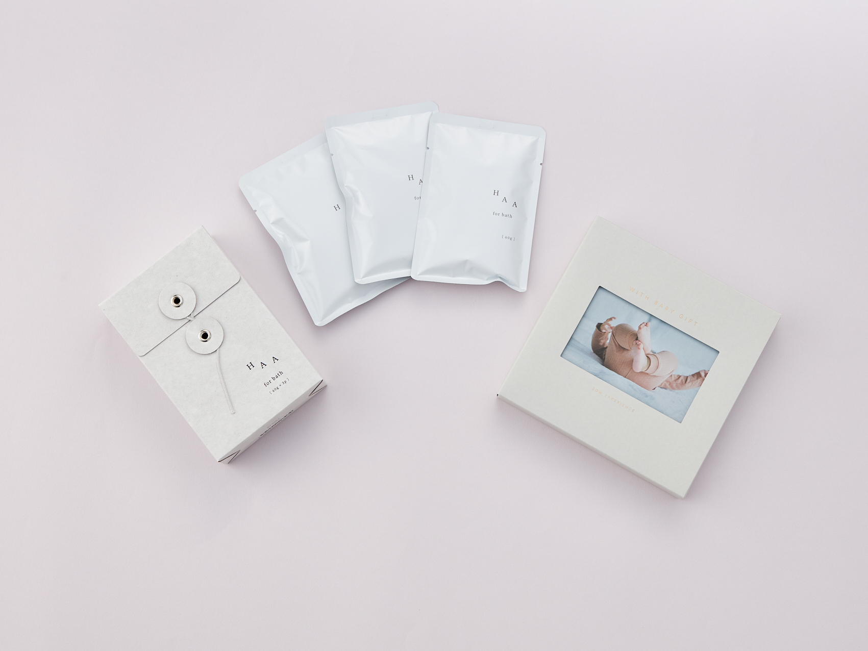 大口注文・法人のお問い合わせはこちらお出かけして楽しむ体験や、絵本・おもちゃなど自宅に届くもの、ベビーケア・ベビーサインレッスン等のコースを収録した「WITH BABY GIFT」とHAA for bathを3袋詰めたプチギフト「HAA for bath 小箱」がセットになってタンプ限定ギフトとして登場!