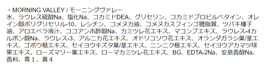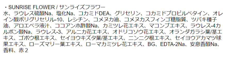 | 成分 | 【シャワージェル】 商品記事内に記載 【ボディミスト】 ・MORNING VALLEY/モーニングヴァレー 水、エタノール、DPG、PEG-60水添ヒマシ油、(PCA/イソステアリン酸)PEG-40水添ヒマシ油、香料、青1、黄4 ・SUNRISE FLOWER/サンライズフラワー 水、エタノール、DPG、PEG-60水添ヒマシ油、(PCA/イソステアリン酸)PEG-40水添ヒマシ油、香料、赤2 ・SUNNYDAY BEACH/サニーデイビーチ 水、エタノール、DPG、PEG-60水添ヒマシ油、(PCA/イソステアリン酸)PEG-40水添ヒマシ油、香料、青1 ・AFTERNOON FRUITS/アフタヌーンフルーツ 水、エタノール、DPG、PEG-60水添ヒマシ油、(PCA/イソステアリン酸)PEG-40水添ヒマシ油、香料、黄4、赤2 ・TWILIGHT FOREST/トワイライトフォレスト 水、エタノール、DPG、PEG-60水添ヒマシ油、(PCA/イソステアリン酸)PEG-40水添ヒマシ油、香料、青1、黄4 |