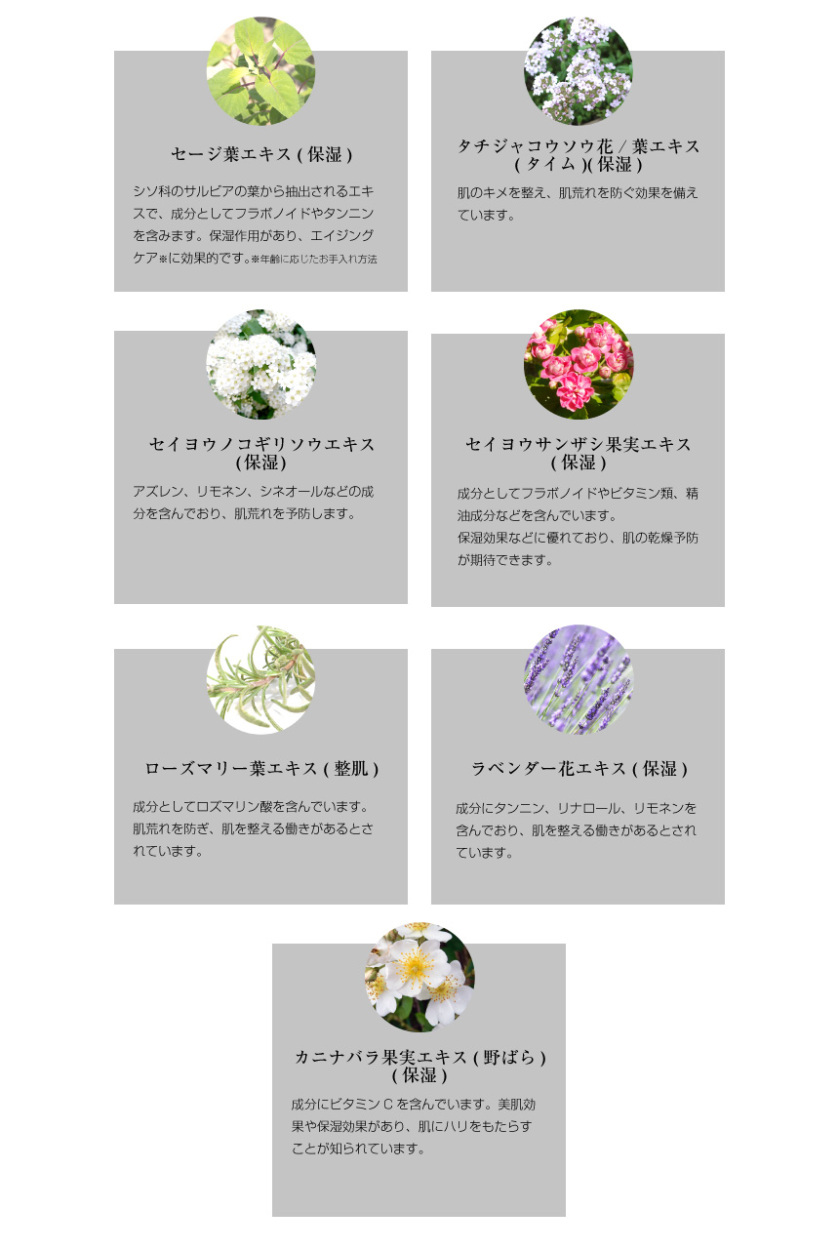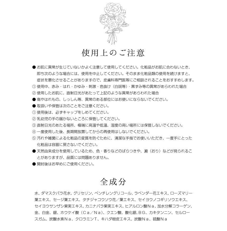| 成分 | 水、ダマスクバラ花水、グリセリン、ペンチレングリコール、ラベンダー花エキス、ローズマリー葉エキス、セージ葉エキス、タチジャコウソウ花/葉エキス、セイヨウノコギリソウエキス、セイヨウサンザシ果実エキス、カニナバラ果実エキス、ヒアルロン酸Na、加水分解コラーゲン、金、白金、銀、ホウケイ酸(Ca/Na)、クエン酸、酸化銀、BG、カキタンニン、セルロースガム、炭酸水素Na、クロラミンT、キハダ樹皮エキス、炭酸Na、硫酸Na |
