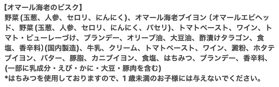 | 注意事項 | 【オマール海老のビスク】には、はちみつを使用しておりますので、1歳未満のお子さまには与えないでください。 |