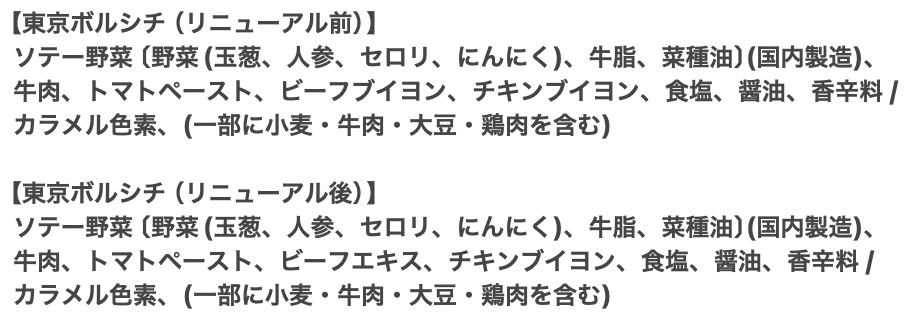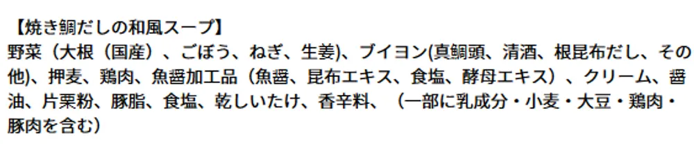 | アレルゲン | 【オマール海老のビスク】 乳成分・えび・かに・大豆・豚肉 【東京ボルシチ】 小麦・牛肉・大豆・鶏肉 【とうもろこしとさつま芋のスープ】 乳成分・大豆 【ミネストローネ】 なし 【東京参鶏湯】 鶏肉 【焼き鯛だしの和風スープ】 乳成分・小麦・大豆・鶏肉・豚肉 |