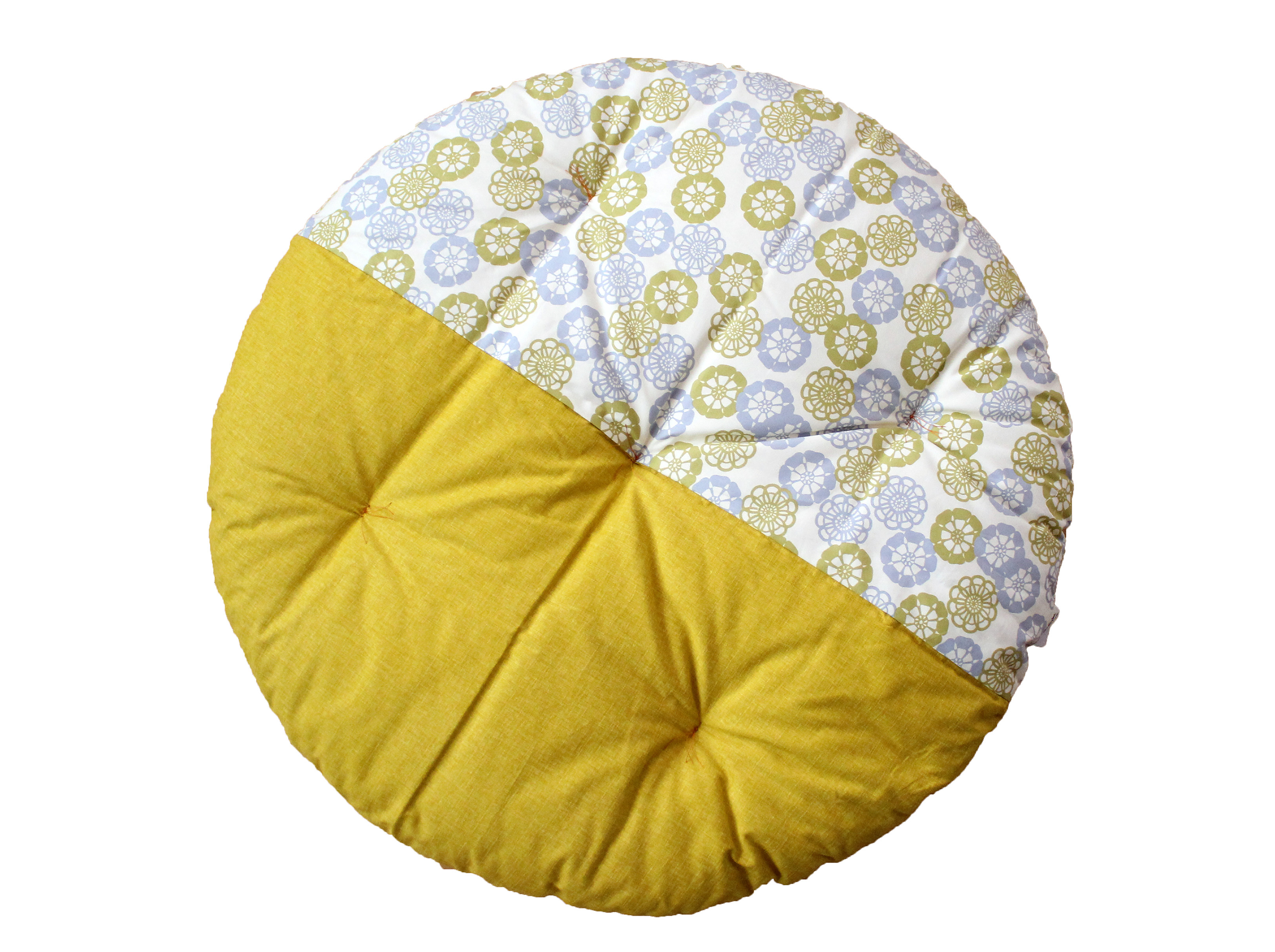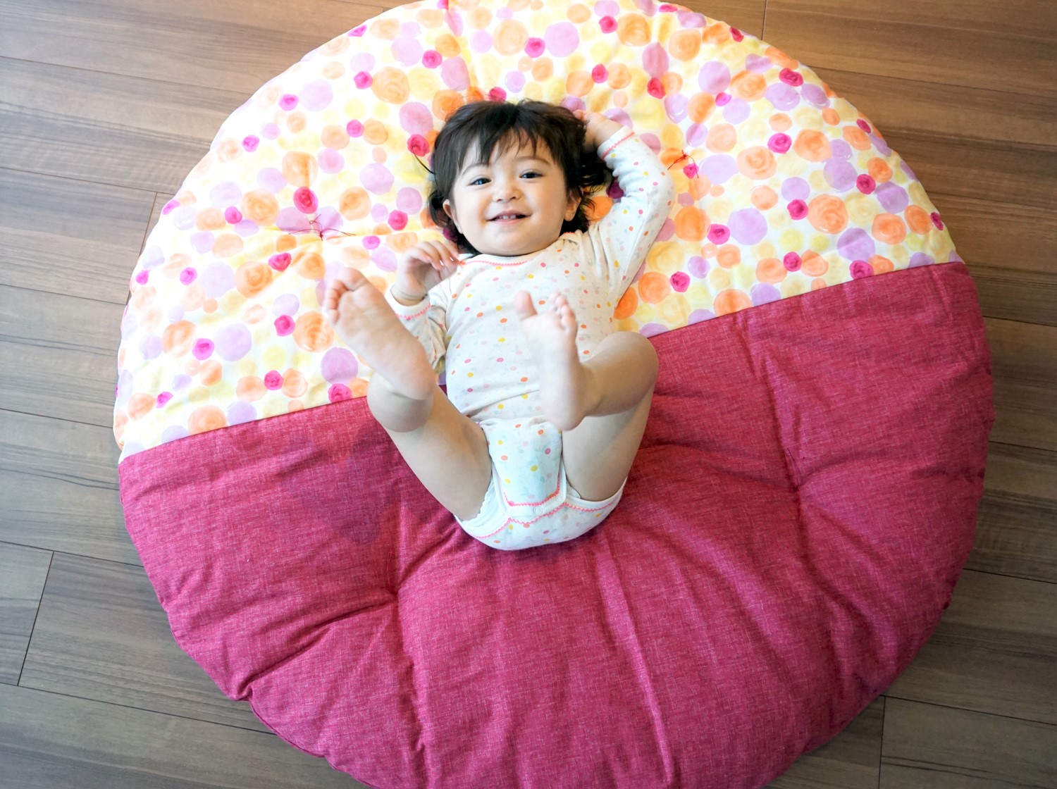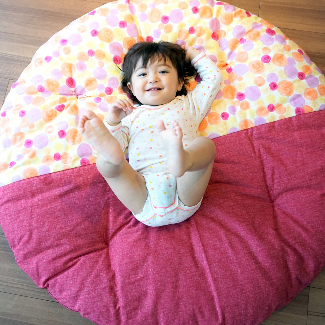 大口注文・法人のお問い合わせはこちら直径約100㎝の大きな丸いお座布団。側生地は綿100%を使用し、綿わたが入ることでふわふわし過ぎず、ちょうどいいやわらかさに。職人がひとつひとつ丁寧に手づくりするせんべい座布団の心地良さは、お子様の笑顔を引き出してくれます。