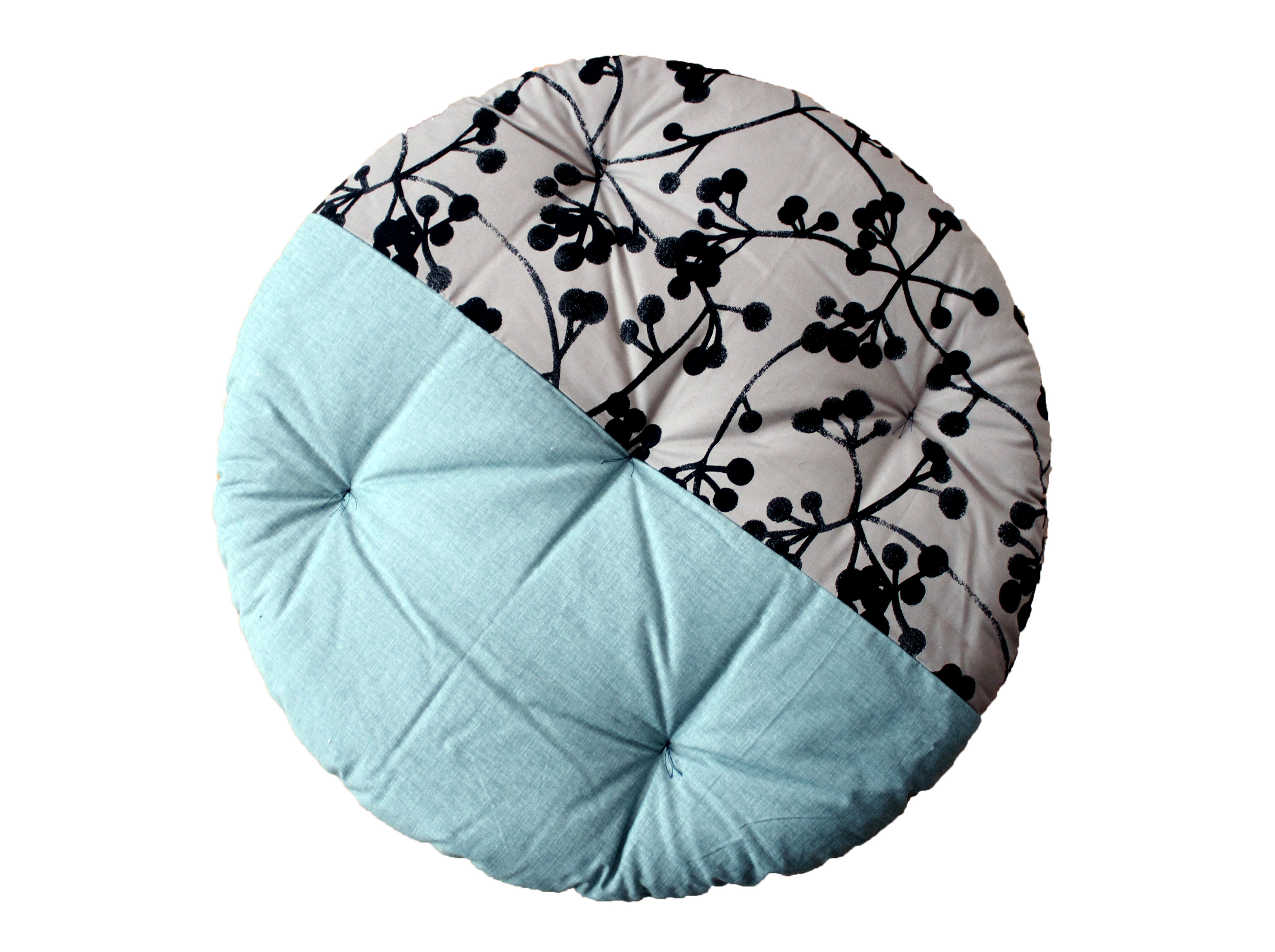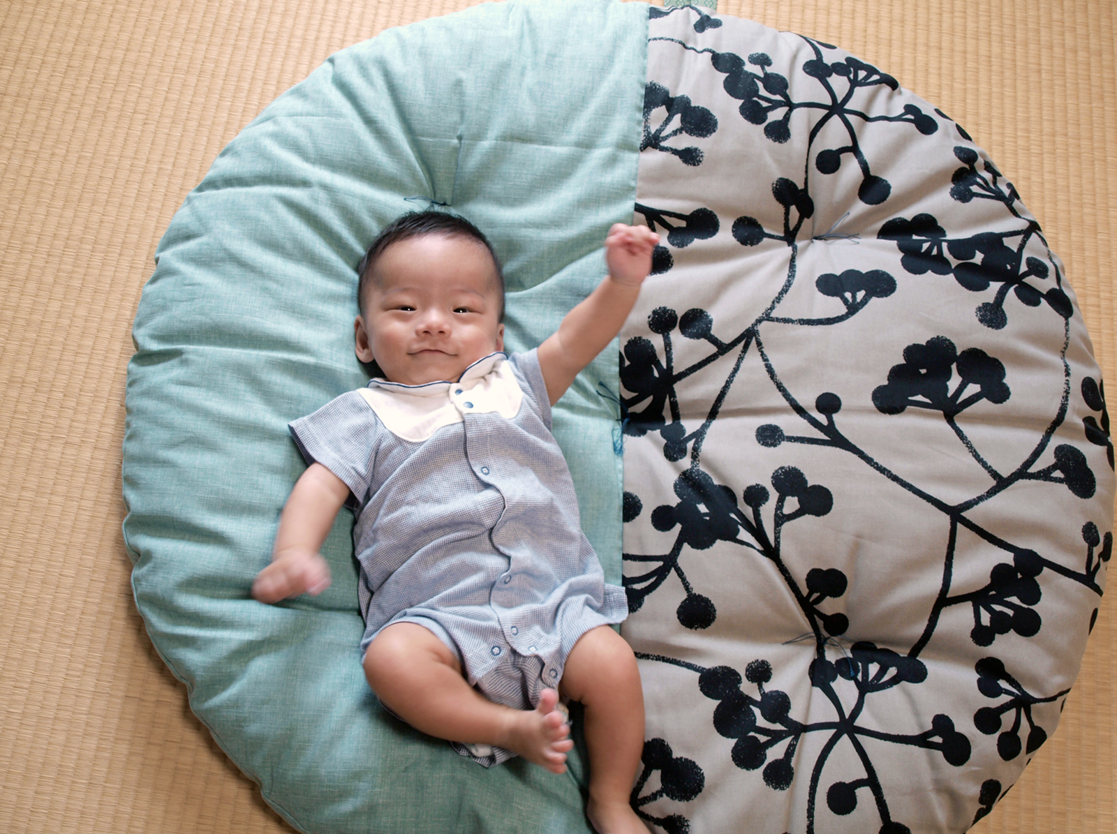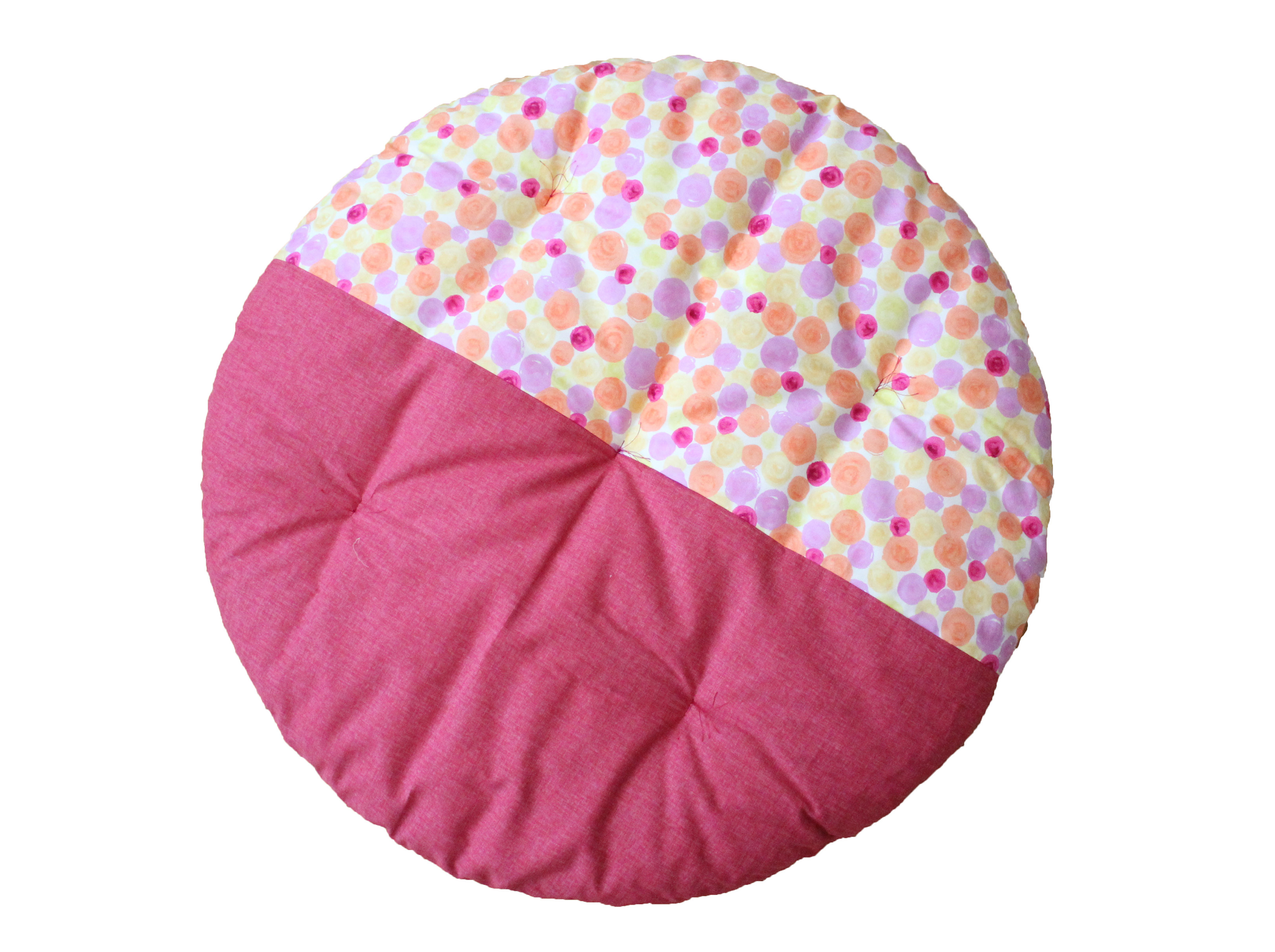 大口注文・法人のお問い合わせはこちら直径約100㎝の大きな丸いお座布団。側生地は綿100%を使用し、綿わたが入ることでふわふわし過ぎず、ちょうどいいやわらかさに。職人がひとつひとつ丁寧に手づくりするせんべい座布団の心地良さは、お子様の笑顔を引き出してくれます。