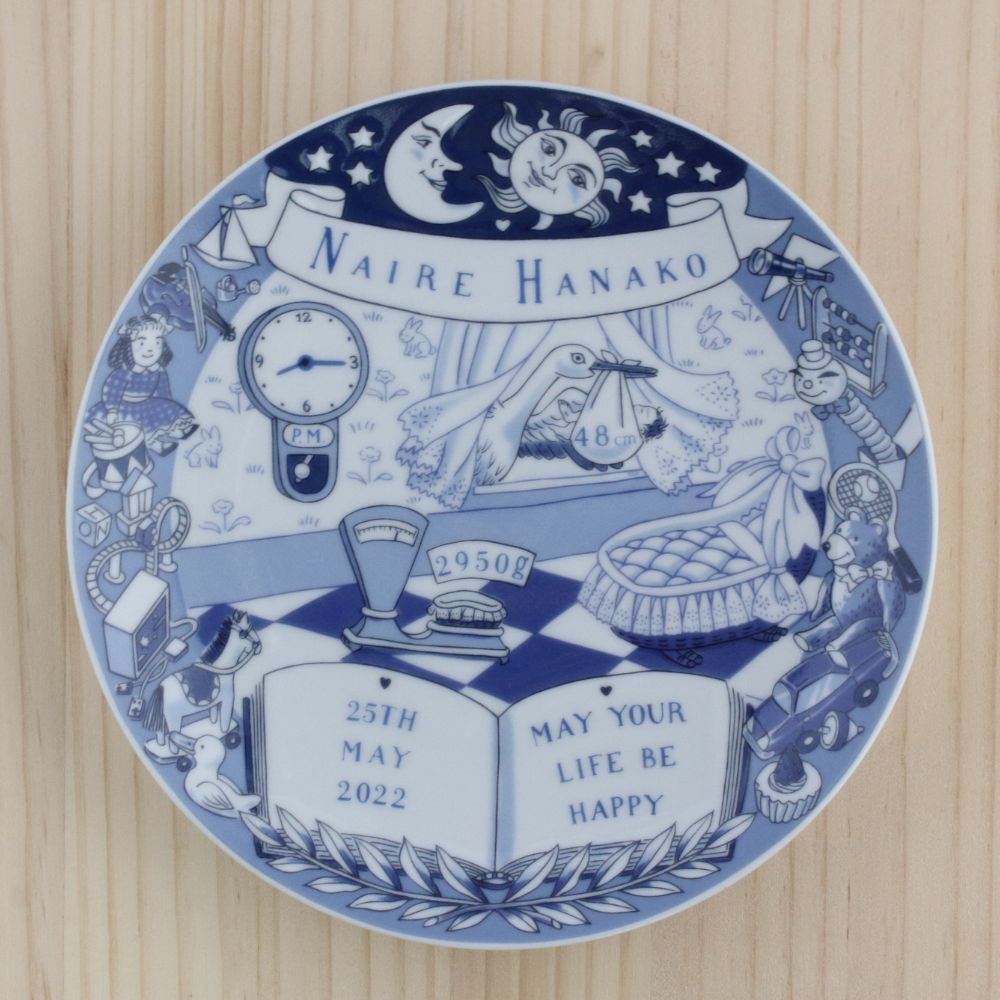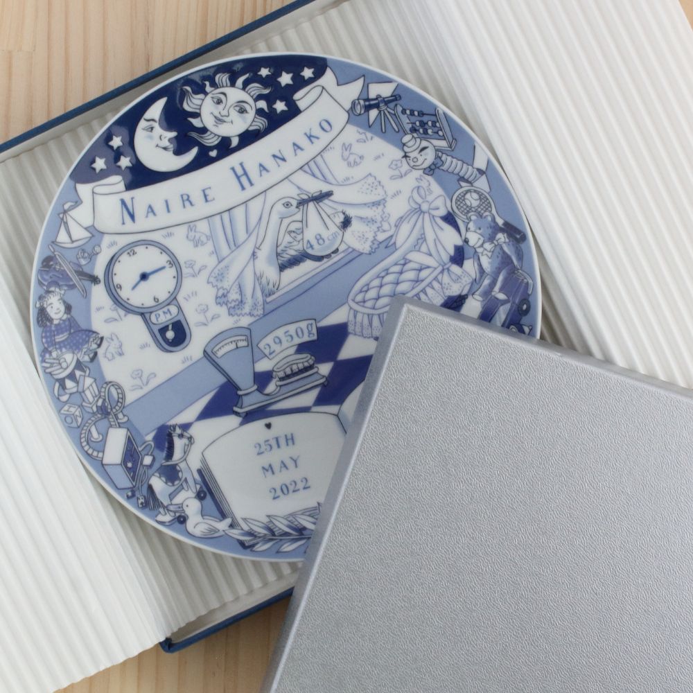 大口注文・法人のお問い合わせはこちら赤ちゃんのお名前や出生の日時、体重などをお入れして焼き上げるオランダのデルフト焼き(デルフトブルーと呼ばれる独特の色合い)を日本・美濃の窯元で再現した美しいエンボス加工の陶器の絵皿です。 成長したお子様が1度は手に取って眺める光景を想像した、楽しいデザインに仕上げました。お子様の出生時の思い出を出生記録を綴った絵皿という形にして残してみてはいかがでしょうか。