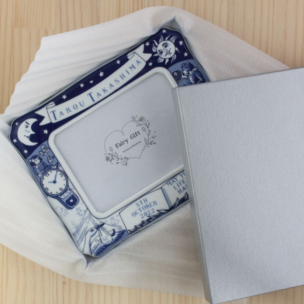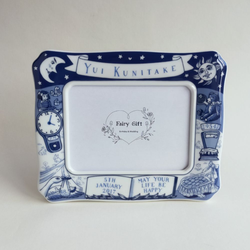 出生記録を陶器に綴るFairyGiftのフォトフレームです。お名前や出生記録をお入れして、フォトフレームに仕上げます。オランダのデルフト焼きを美濃の窯元で再現しました。お子様の誕生の記録をする各パーツは加工が施されており立体感があります。世界に1つの贈り物としていかがでしょうか。