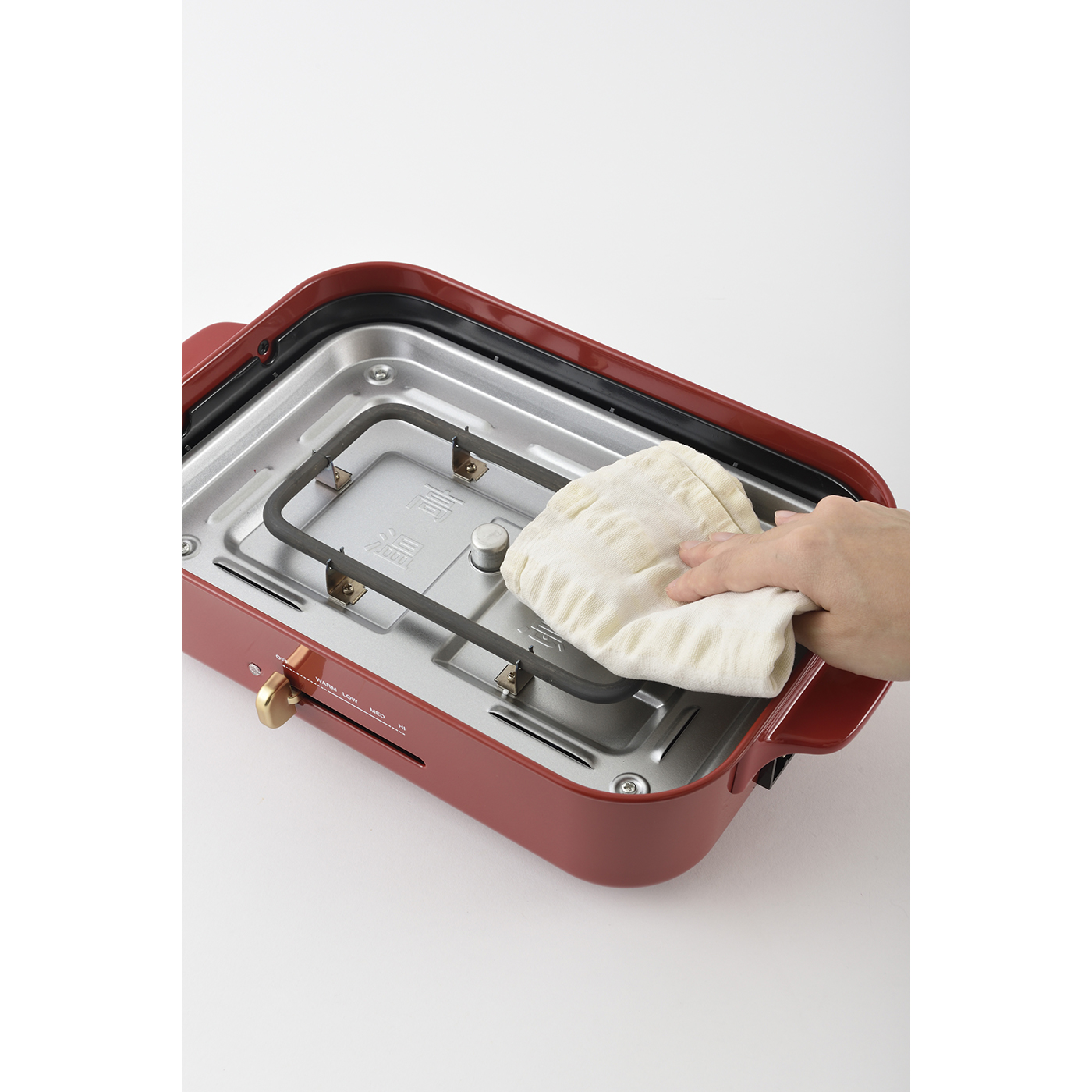 ホーロー鍋をイメージしたあたたかみのあるデザインで、インテリアや調理シーンにもぴったり。 2~3人にちょうど良いサイズで、毎日のお料理~おうちパーティーまで幅広く食卓で“つくる”を愉しめます。 プレート、本体、フタの一体感を重視し、ぱっと見でホットプレートには見えない高級感を追求しました。テーブルの上に料理をそのまま出しても、盛り上がること間違いなしです。
