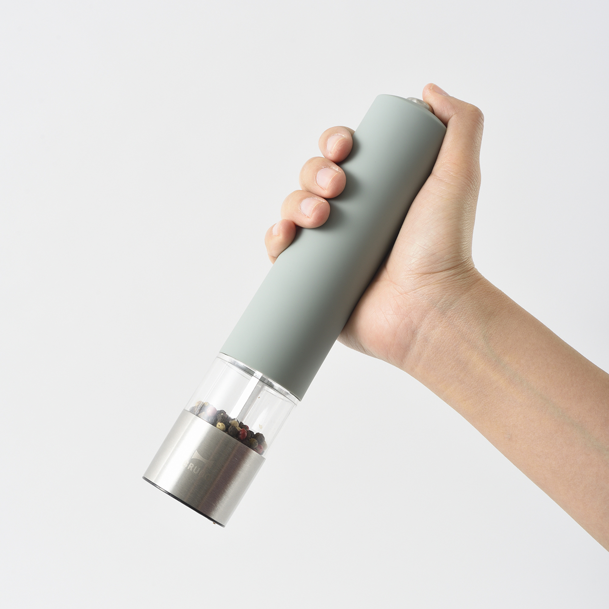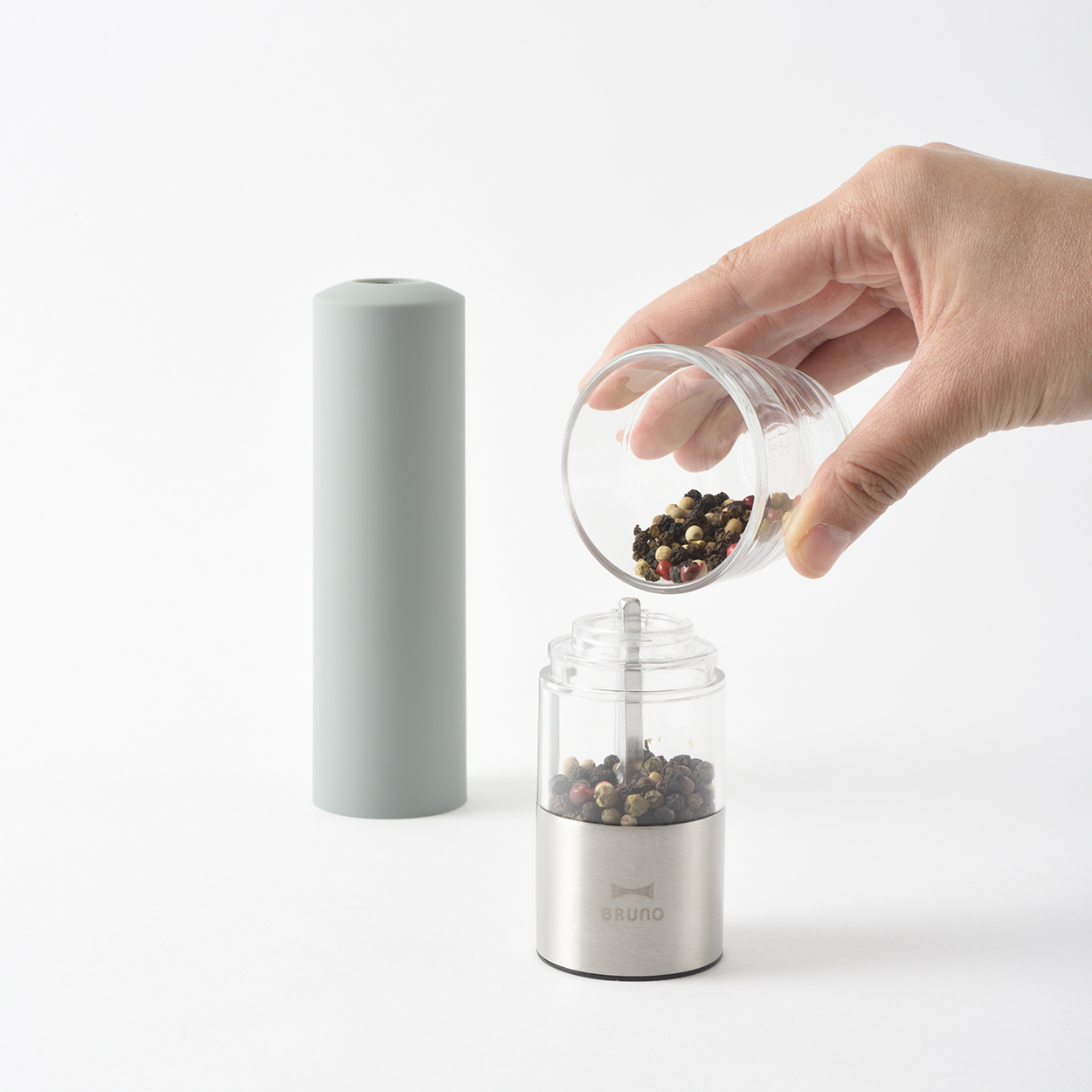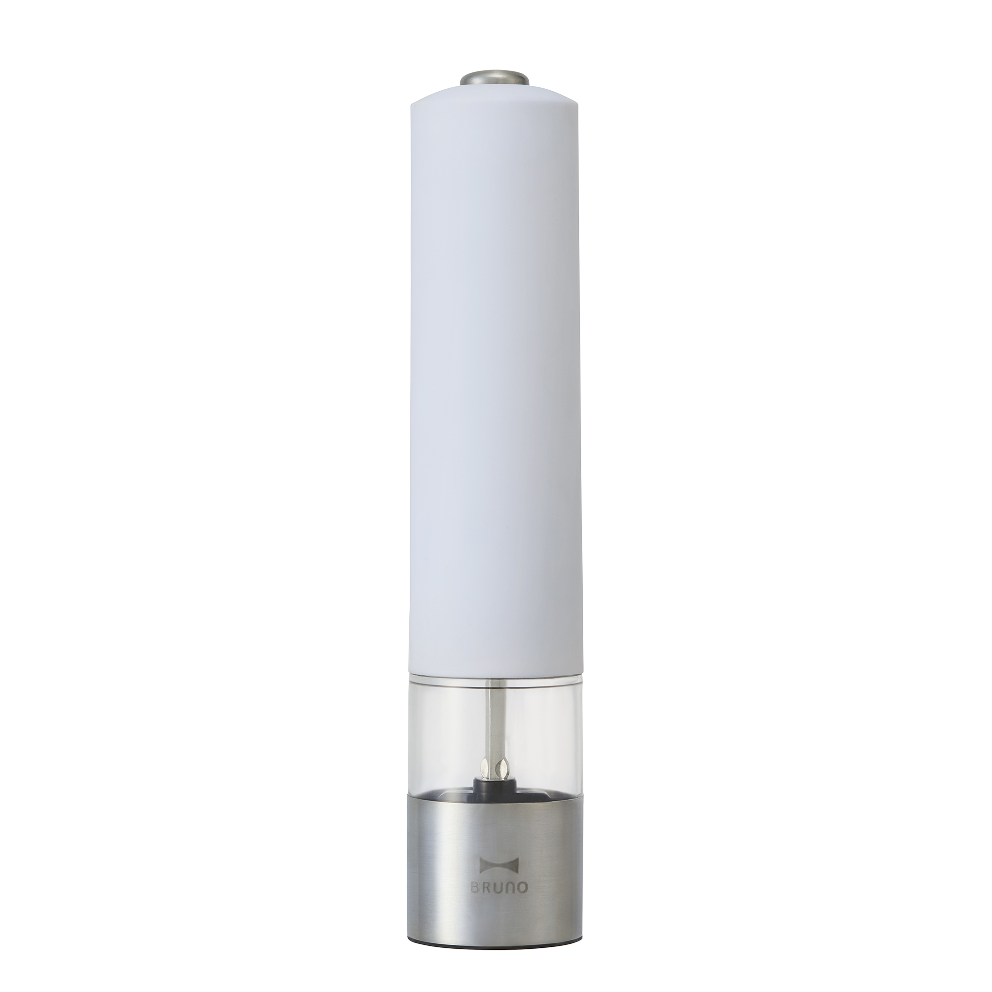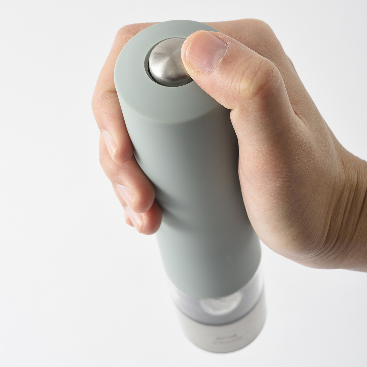 調理しながら片手で挽ける!電動式の光るスパイスミル。ボタンひとつの簡単操作で、調理中でも片手でスパイスが挽ける電動ミル。LEDライト付きで暗い場所でもスパイスの量を確認できます。