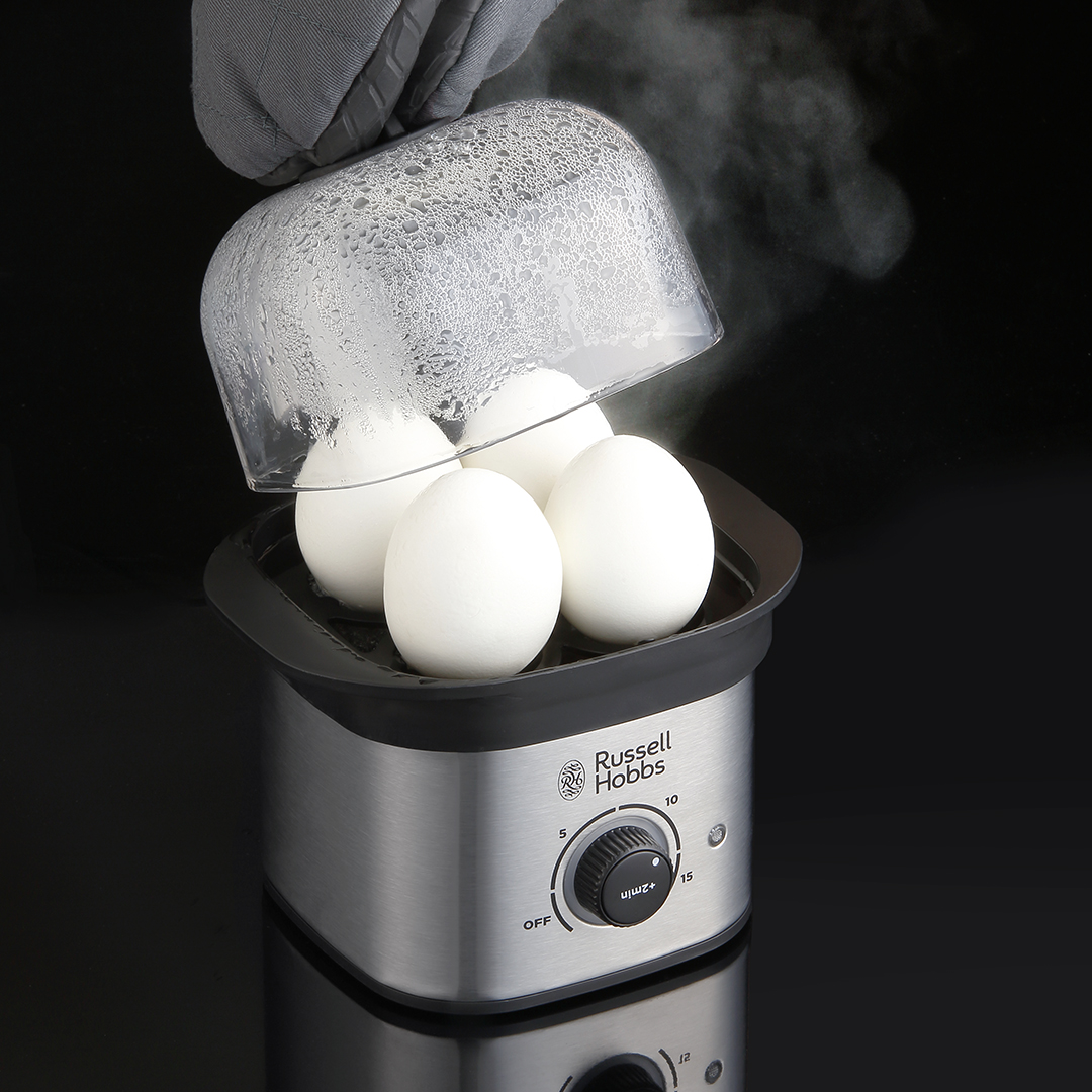 卵を蒸すためのエッグトレイ付き。面倒なゆで卵づくりもタイマーでおまかせ。350Wのハイパワーで素早く蒸しあがります。ゆで卵なら約10分。ジャガイモやニンジン、カボチャといった、硬めの野菜を入れたホットサラダも約15分でできあがり。忙しい人ほど日常に取り入れたいですね。