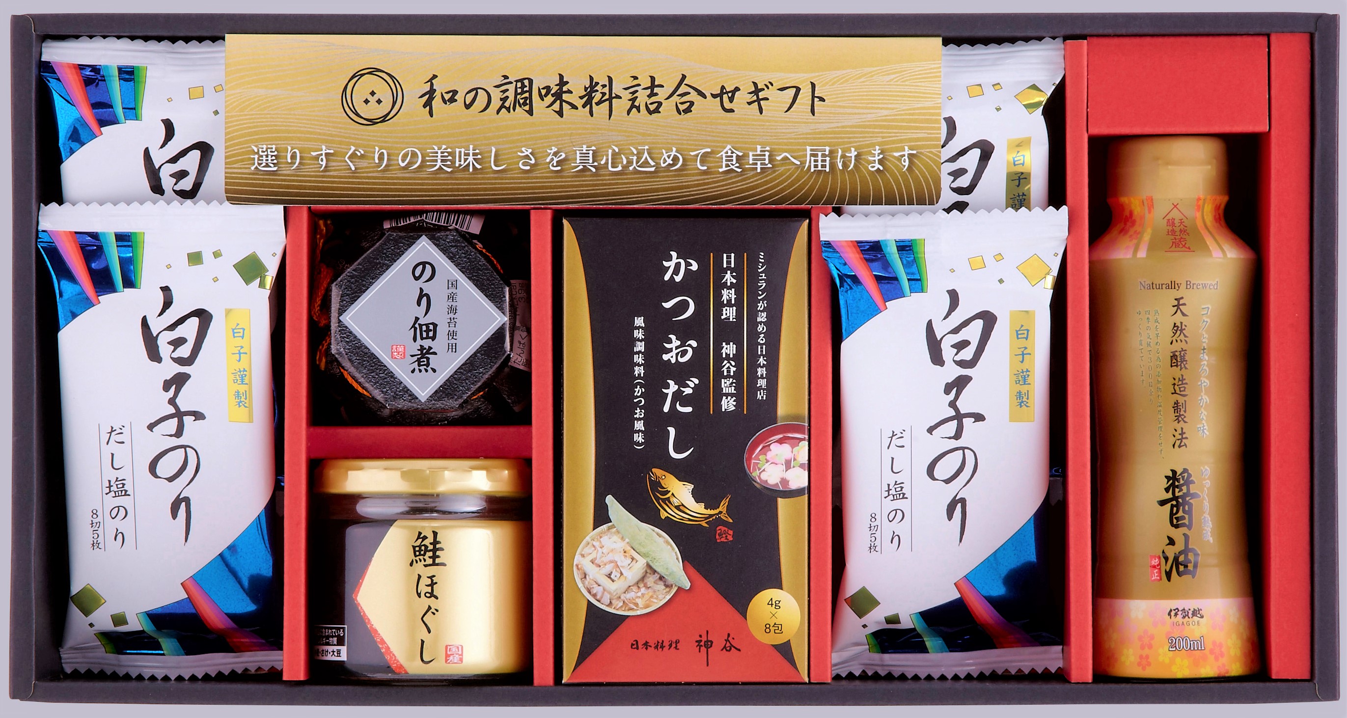 大口注文・法人のお問い合わせはこちら日本料理界のトップを50年以上走り続けてきた巨匠「神谷昌孝」監修の「かつおだし」がはいった「のり佃煮」「鮭ほぐし」「伊賀越天然醸造醤油(シュリンク)」「白子のり味のり・だし塩のり」の詰合せです。全世代問わず、もらってうれしい商品の詰合せです。ご家庭で食卓にプラスしてお店の味をお楽しみください。