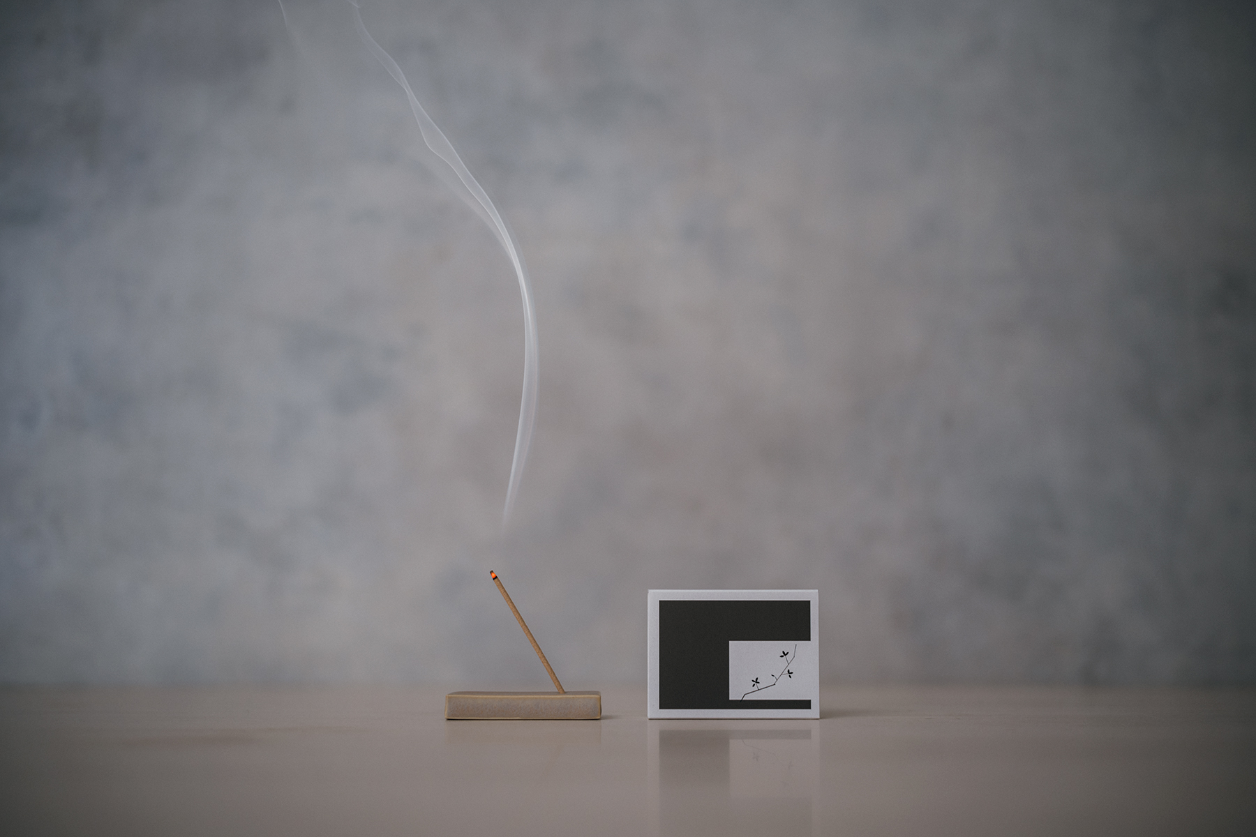 火をともし、香りを聞く。煙を眺め、心をととのえる。自分と向き合う、ひとすじの時間。白と黒のあいだで、ふっと深呼吸。曖昧に溶け合う素直な自分に戻る。やわらかな日々のあわい。素直な自分に戻る「間」としての香り。かたまった言葉や記号が淡く漂う香りの中にじんわりと溶けていく。湖面に揺らめくさざ波のように。