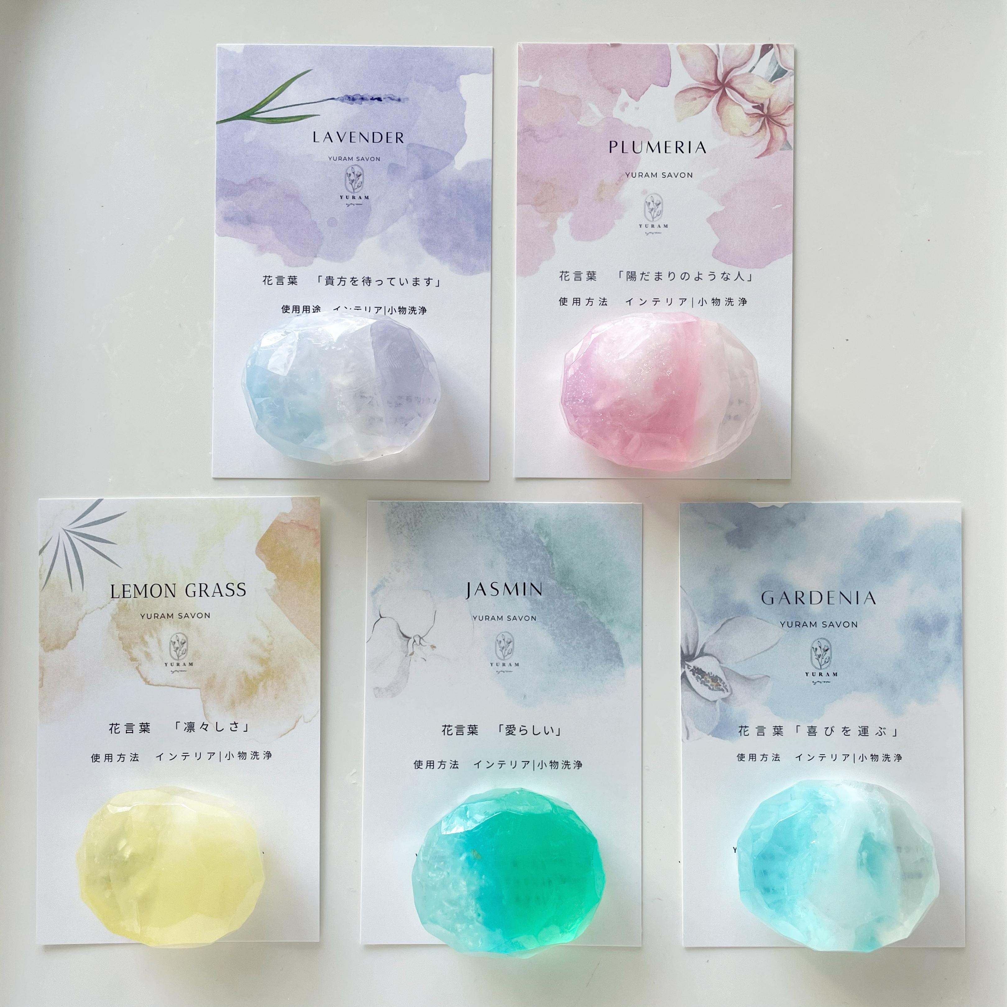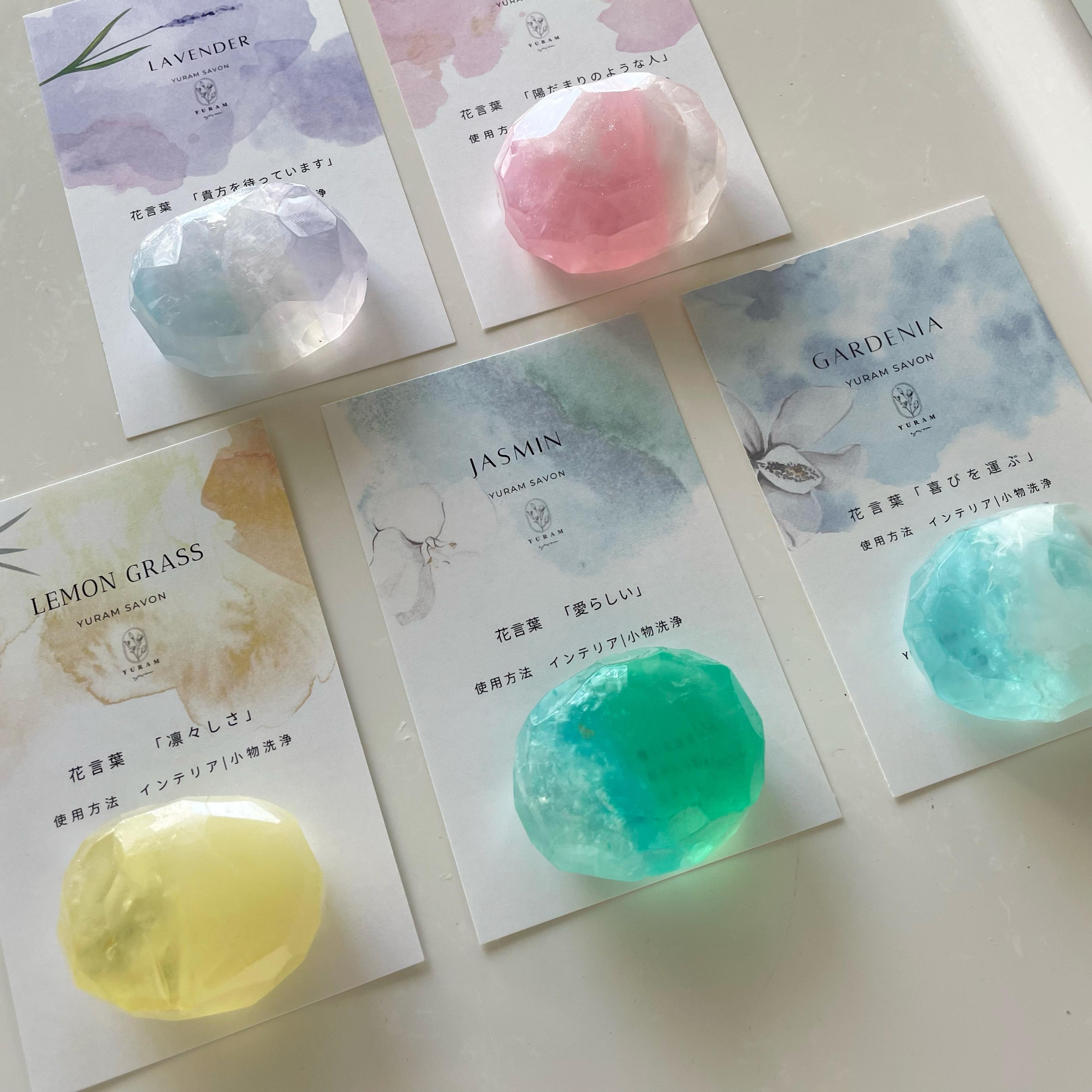 大口注文・法人のお問い合わせはこちら1つ1つ手作業で作り上げる、世界に1粒しかない宝石石鹸です。YURAM独自のカット技術で、四方八方に光を放ちます。香りにもこだわり、厳選した5種類のお花の香りをご用意しています。 ※ハンド・ボディ用の石鹸ではございません。ランドリーソープ(下洗い)としてご使用いただけます。