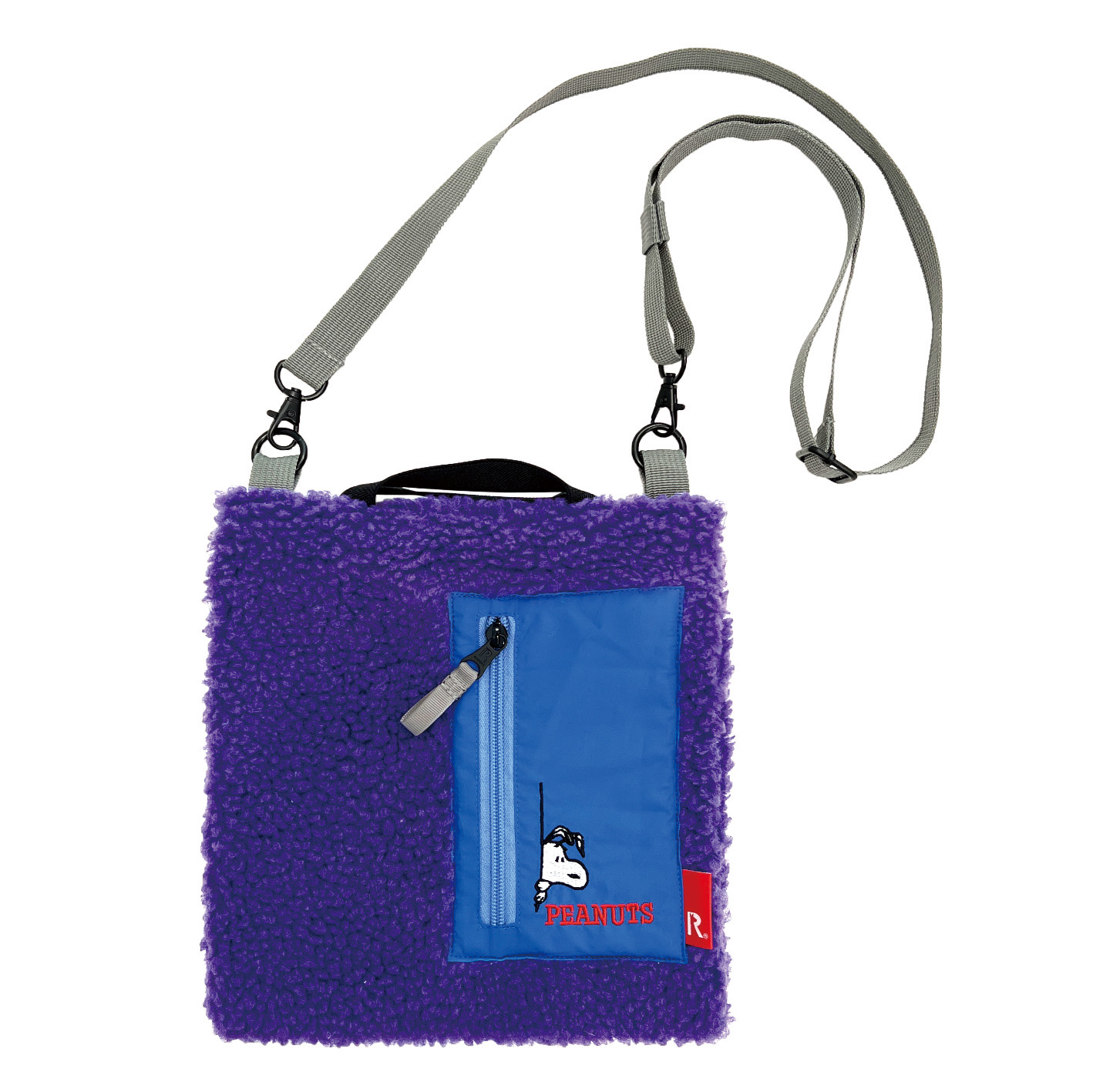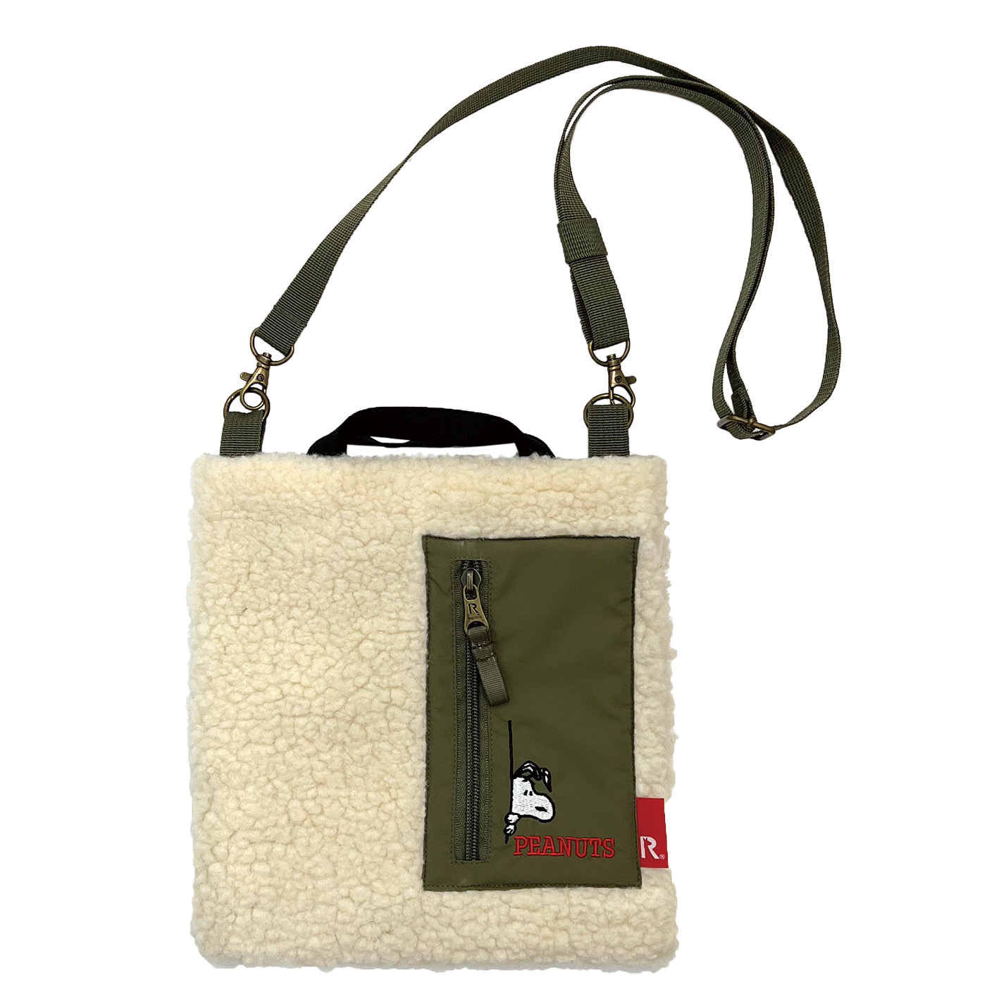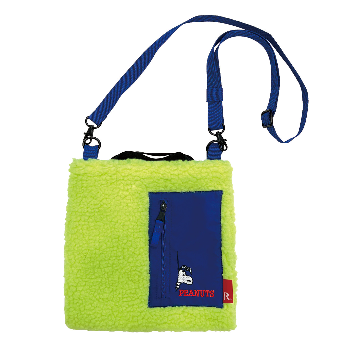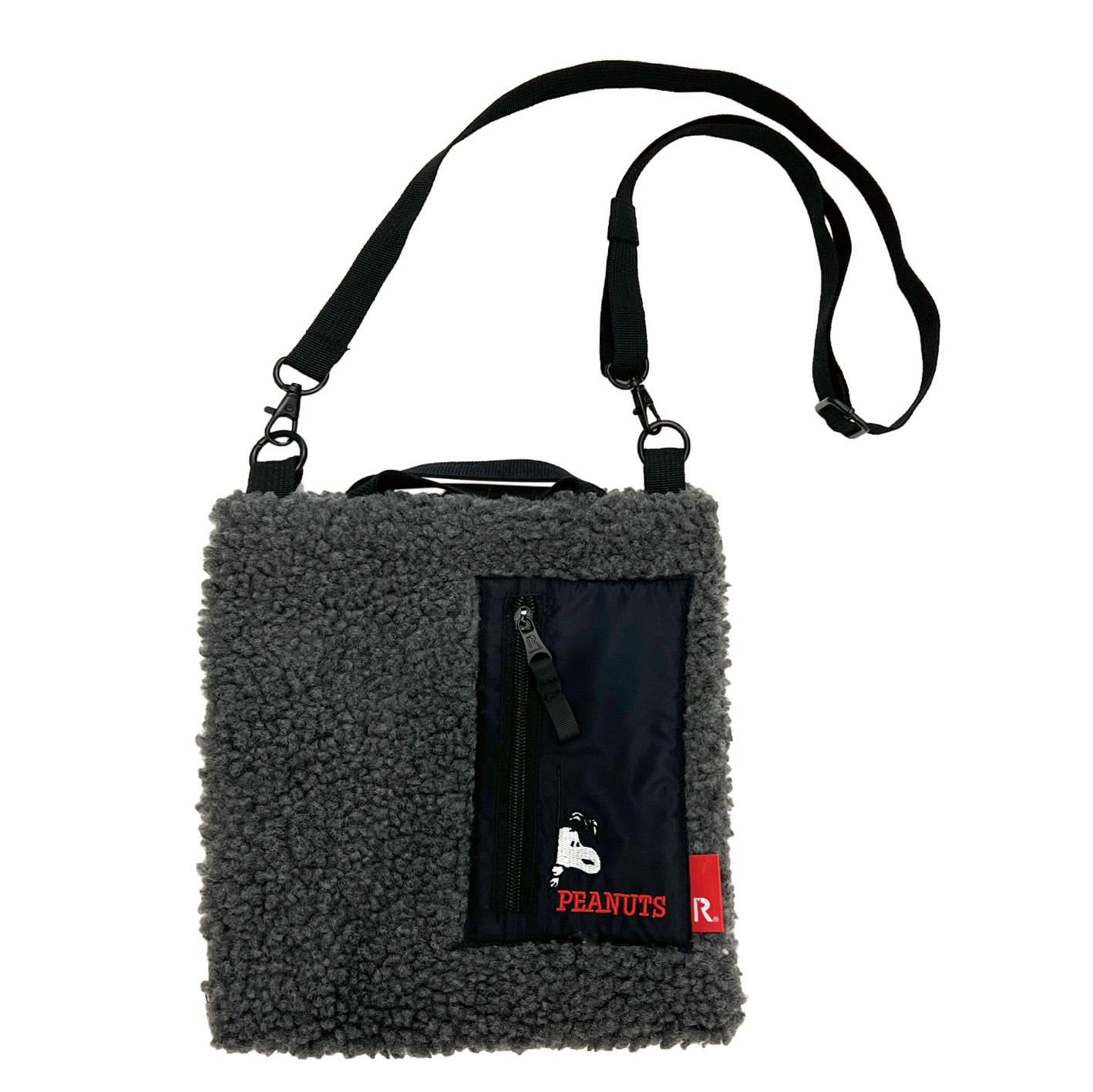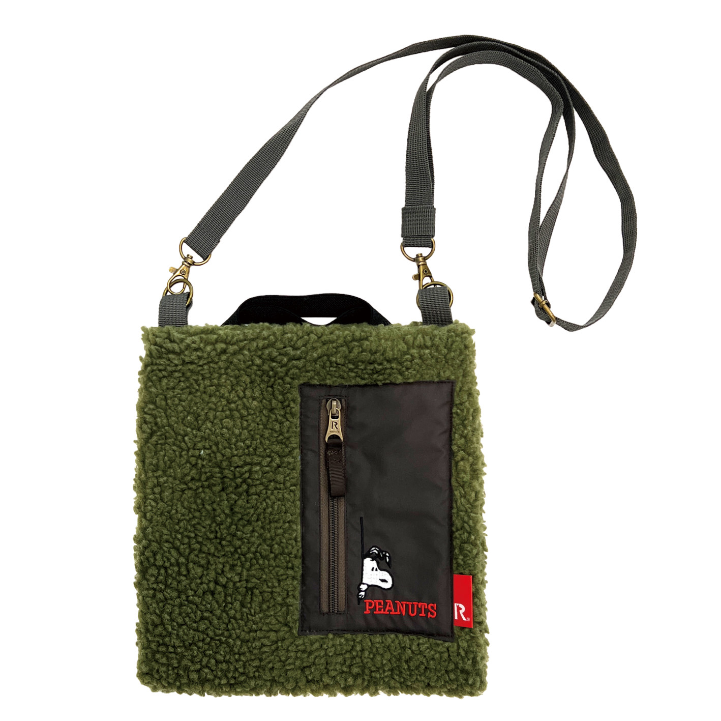 モコモコのボアフリースにファスナーポケットをオン。 ルーポケットからちょこっと顔を覗かせたスヌーピーがポイントです。 平ゴムの短い持ち手が特徴のサコッシュ。 伸縮するので、手持ちだけでなく腕にかけることも可能です。 口元はダブルのドットボタン開閉で、中身が見える心配もなく安心です。 幅広い年代のカジュアルスタイルにマッチします。