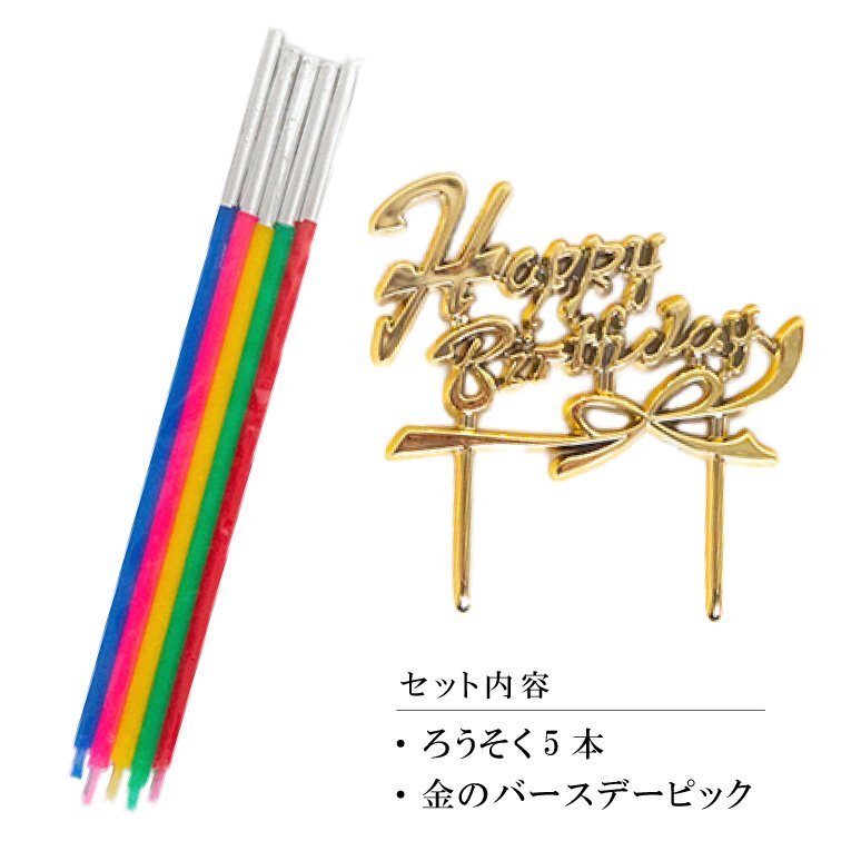ロウソクと金のバースデーピック(HappyBirthday)が付いています。大切な方のお誕生日にお祝いや贈り物としても最適です。