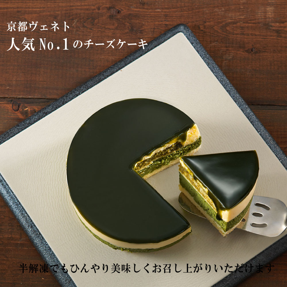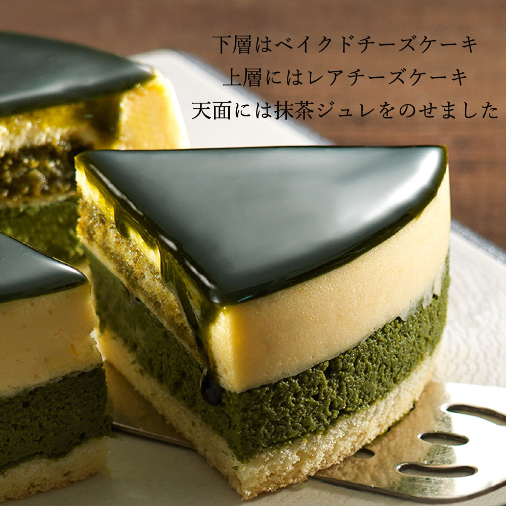 抹茶ベイクドチーズケーキと濃厚レアチーズケーキの2層仕立てになっており断面も鮮やか。 表面のみずみずしい抹茶ナパージュが彩りを加えます。
