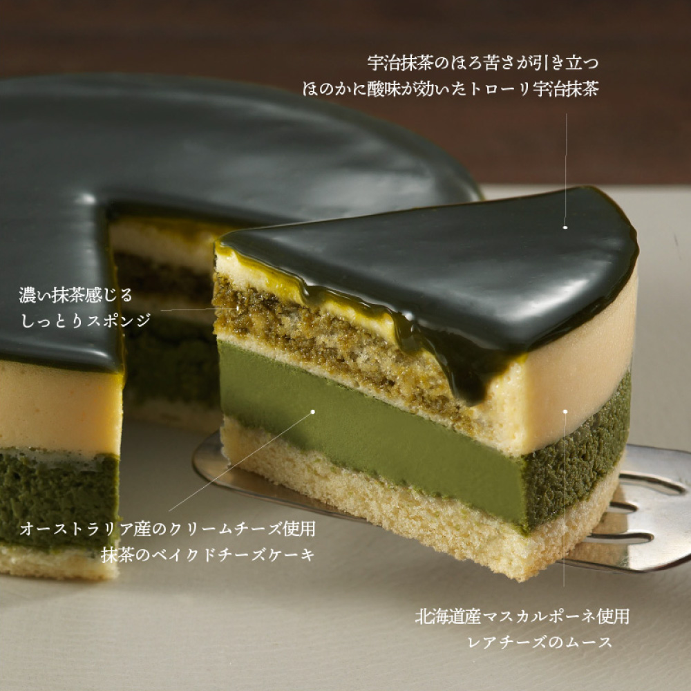 オーストラリア産クリームチーズを使用した抹茶ベイクドチーズケーキと、濃い抹茶をたっぷりと染み込ませたスポンジ、そして表面に宇治抹茶のほろ苦さが引き立つ抹茶ナパージュを贅沢にかけた、抹茶を味わい尽くせる大人のためのチーズケーキです。