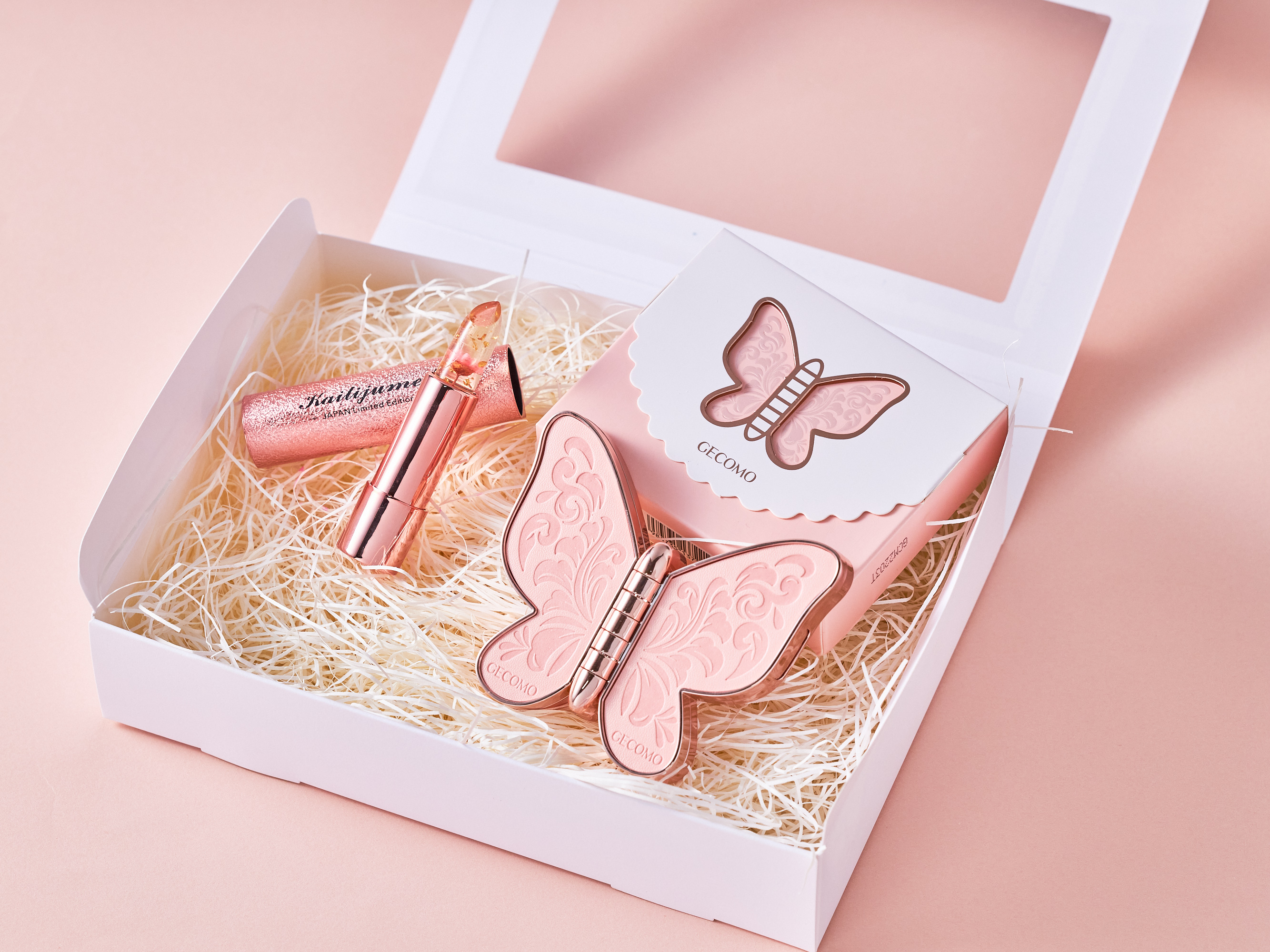 バタフライ型のパッケージがかわいい「GECOMO (ジェコモ)」のアイシャドウパレットと大人気の「Kailijumei(カイリジュメイ)」ティントリップから、日本限定ピンクゴールドモデルをタンプオリジナルギフトボックスに入れてご用意しました。